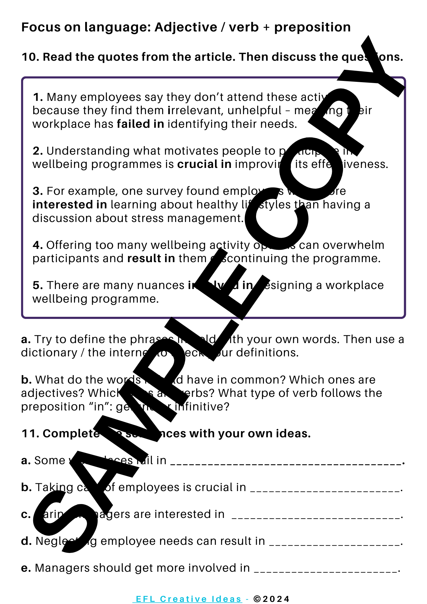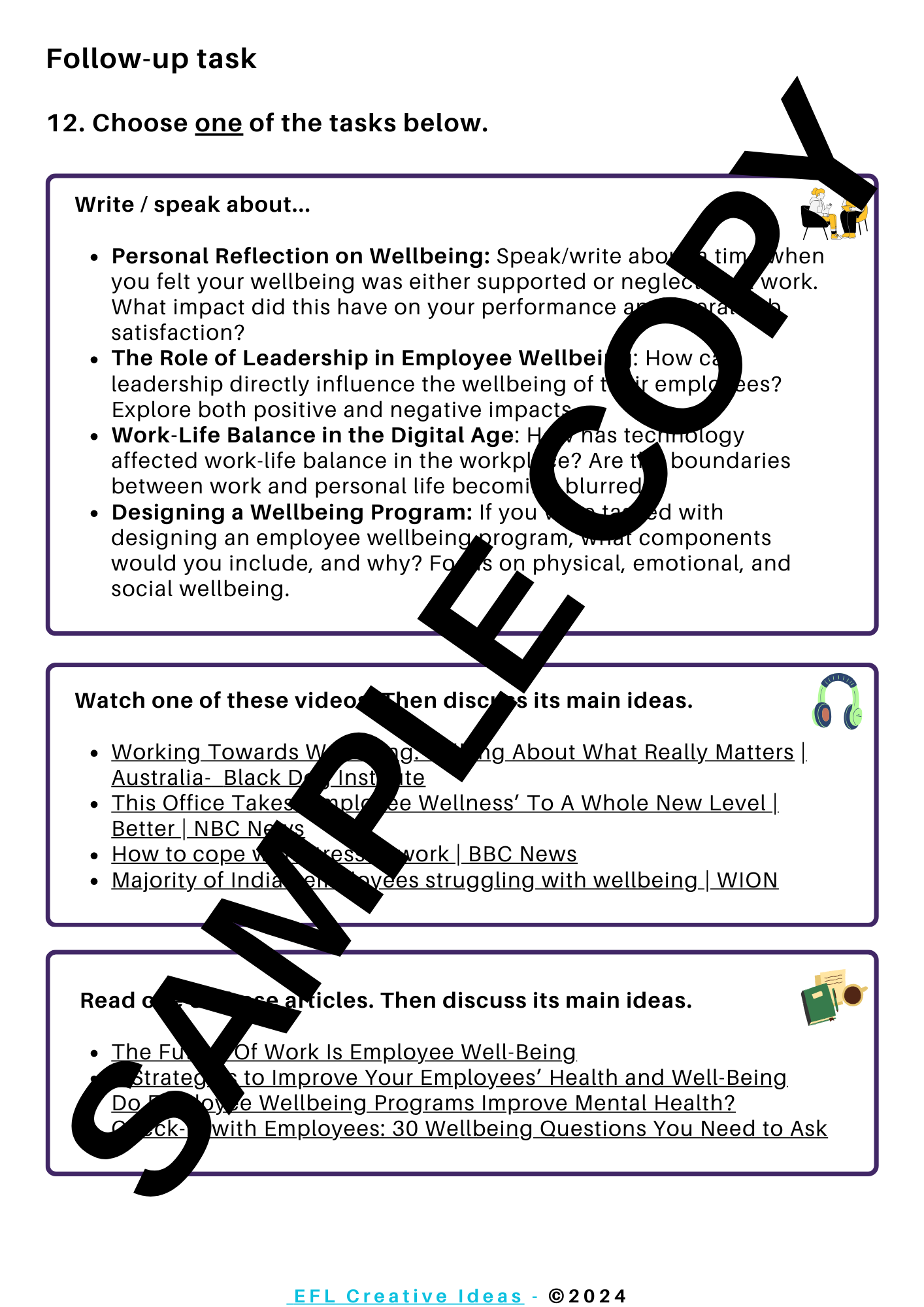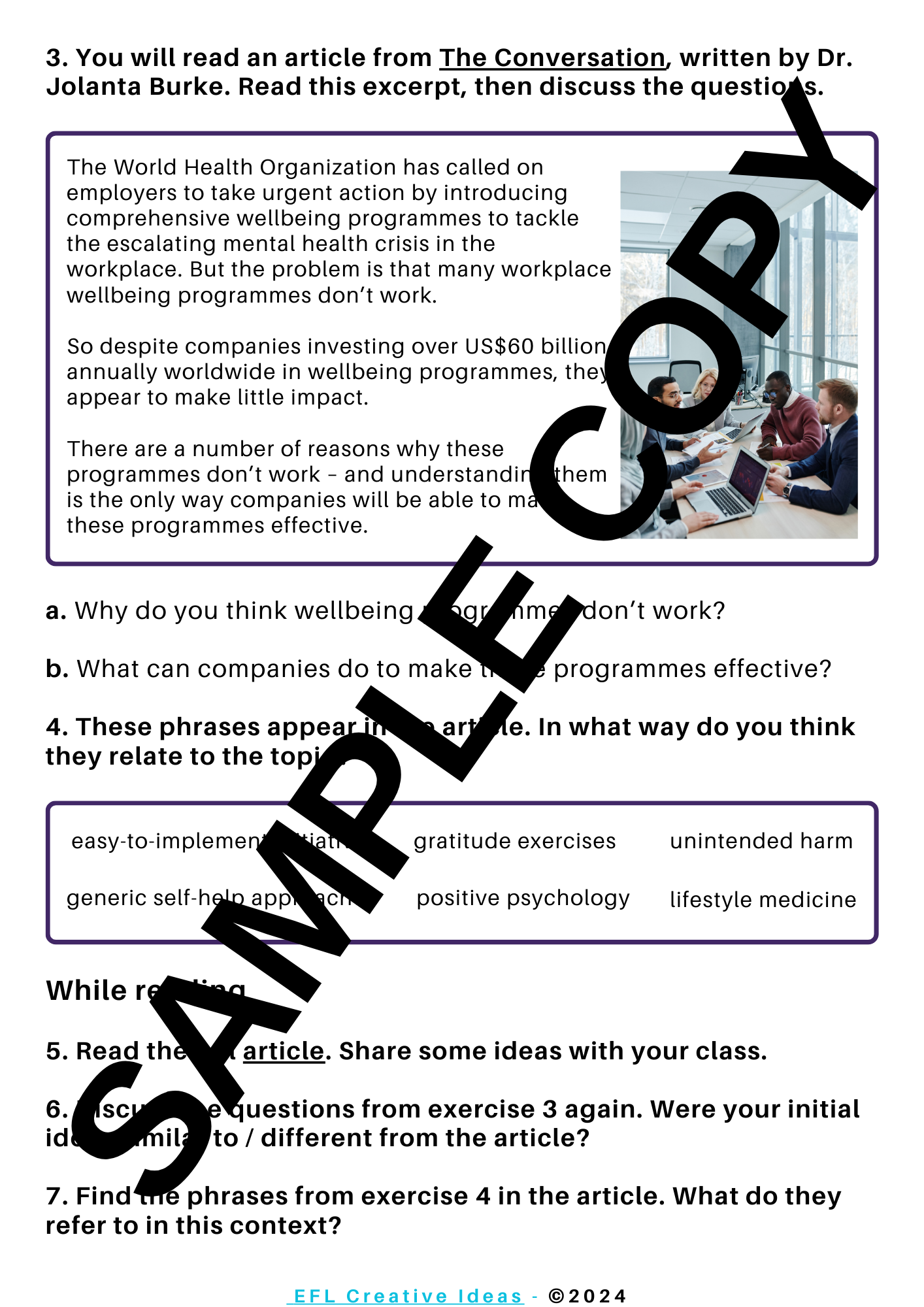 In this lesson, students will define the concept of workplace wellbeing, they will also discuss about different types of wellbeing initiatives in the workplace. They will share their own experiences and predict informatio before reading an article. Students will read for gist and for detail. They will develop crticical thinking skills by analyzing the article's purpose and tone. As for language, students will work on some adjectives and verbs followed by prepositon from the article. By the end of the lesson, students will choose a follow-up task according to their interests and needs.