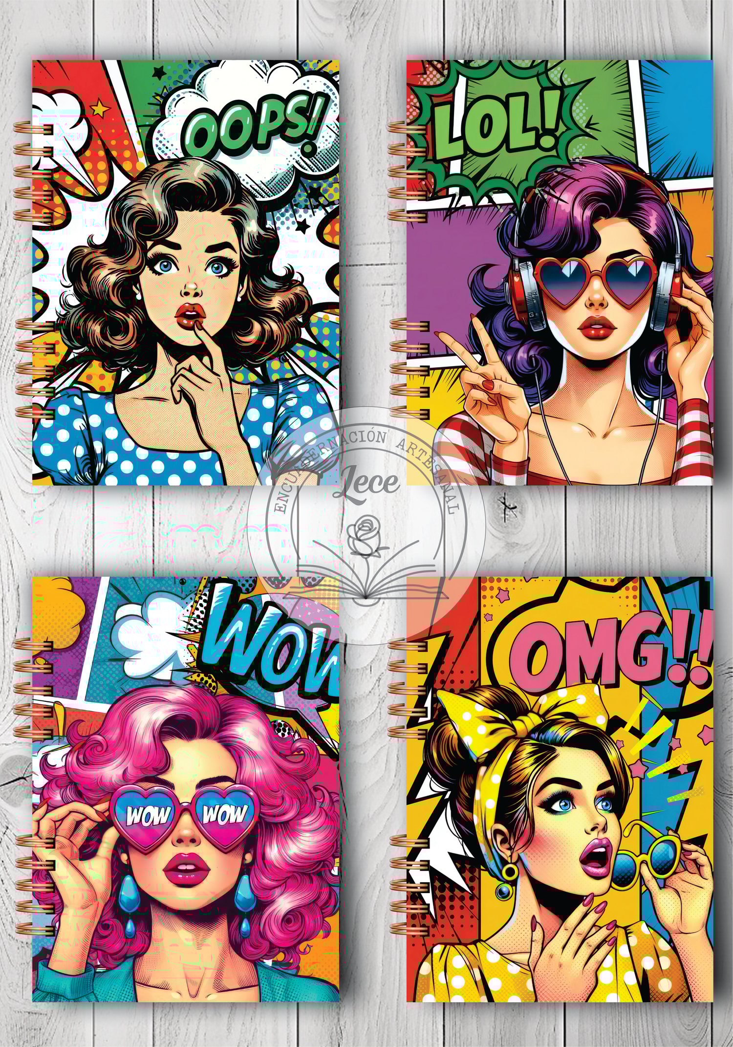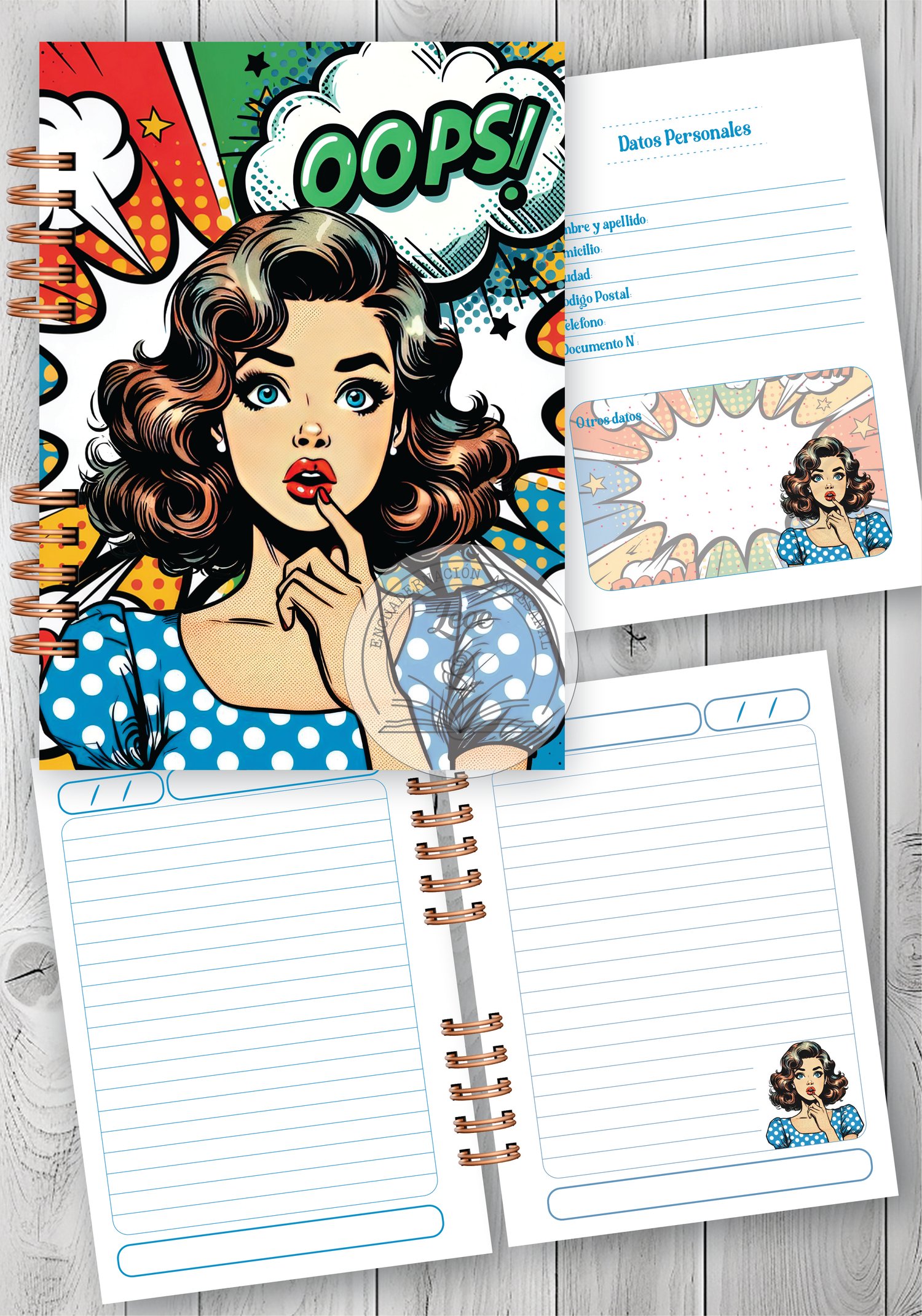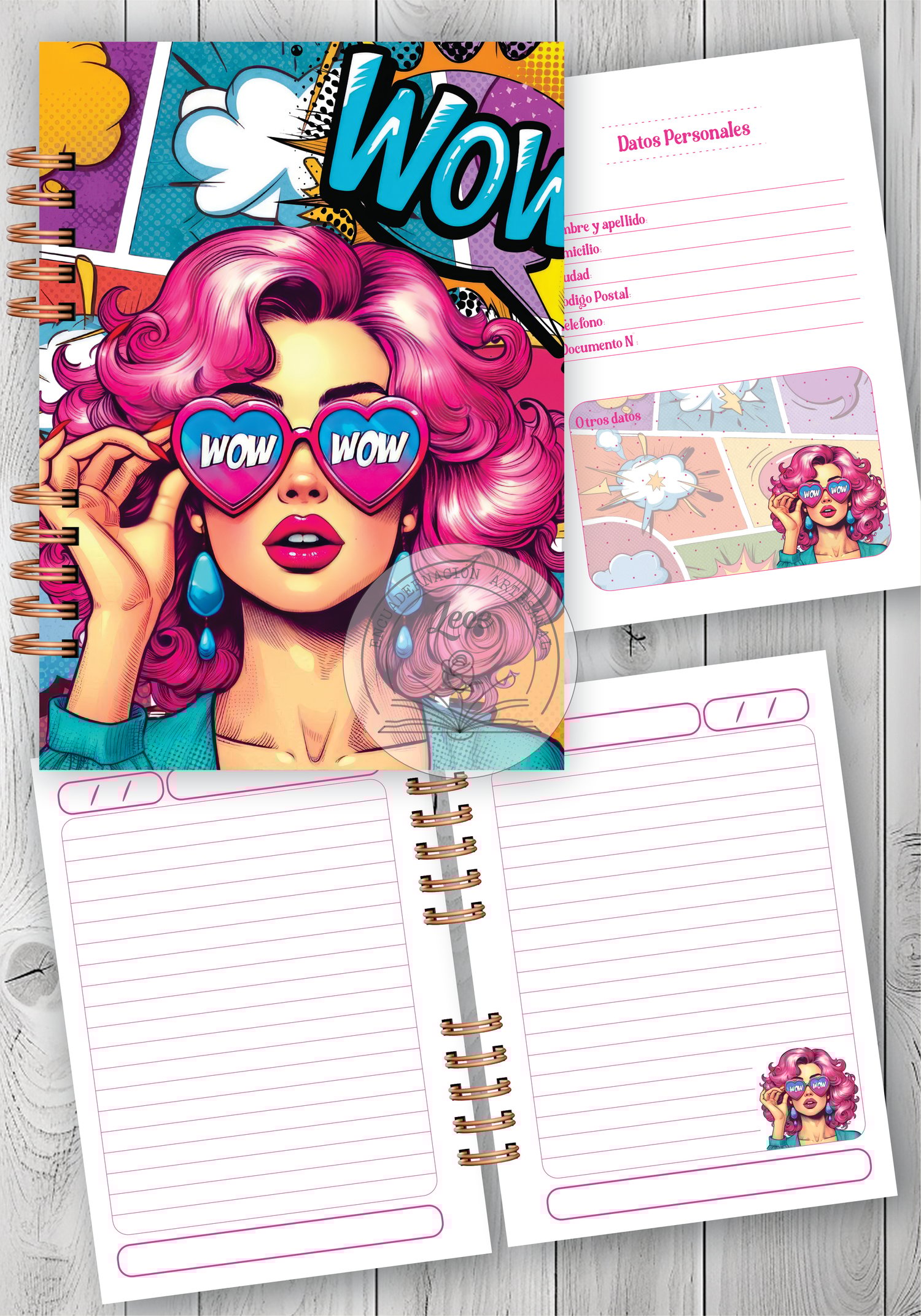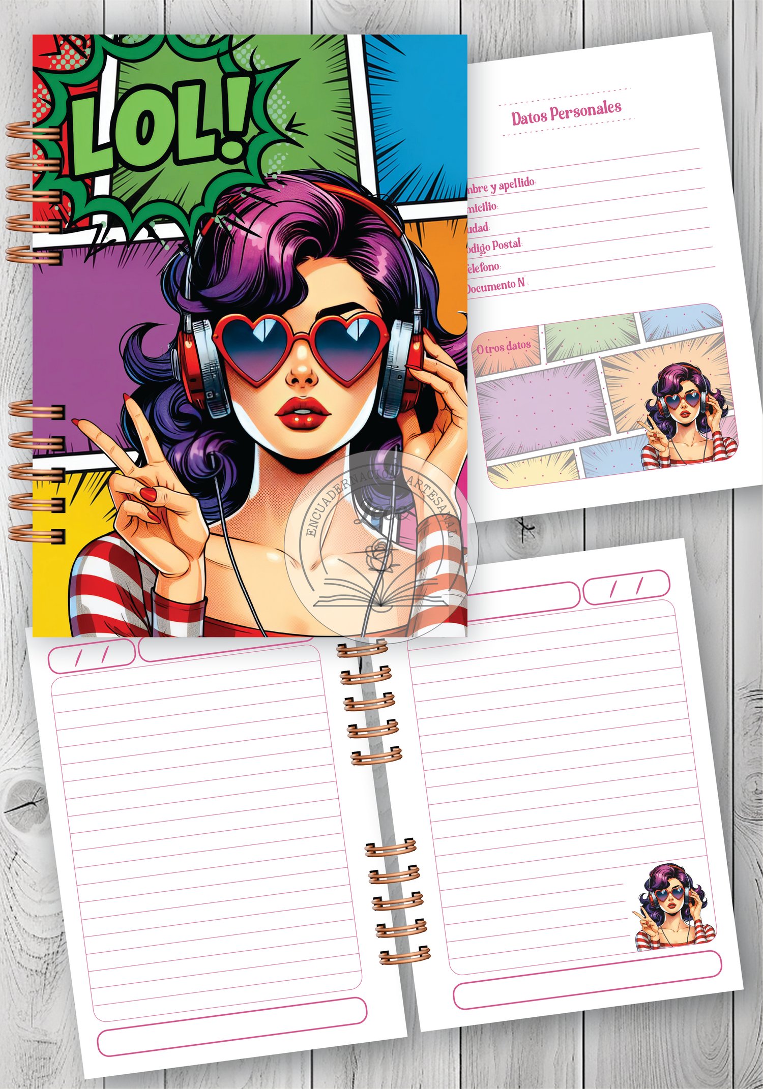 - 4 modelos de interior de 100 hojas rayadas (incluye nota de datos) a tono con las portadas con sus variantes para imprimir en tamaño A5 para anillado y costura