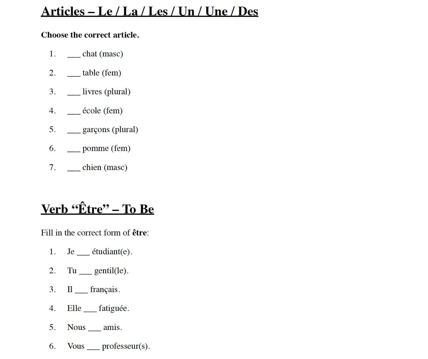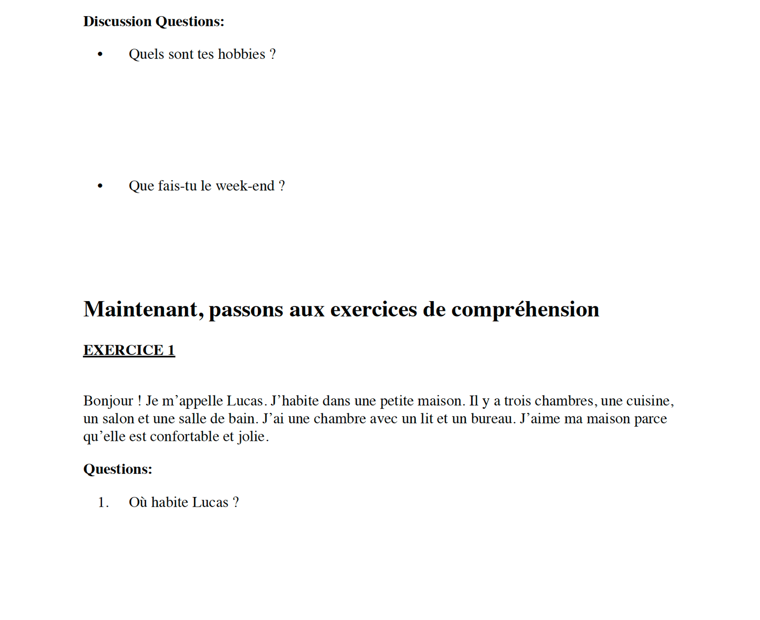These French exercises and practical questions are designed to help learners build confidence and fluency step by step. They contain engaging activities that reinforce vocabulary, grammar, and everyday expressions through real-life situations. Ideal for self-study or classroom use, the exercises encourage active learning, improve comprehension, and support learners in applying French naturally and effectively in daily communication.