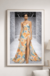 The abstract geometric print blends warm coral, amber gold, soft teal, and muted ivory tones, creating a timeless yet contemporary aesthetic. Styled with minimalist gold heels and statement earrings, the look evokes luxury fashion week energy, editorial refinement and artistic confidence.