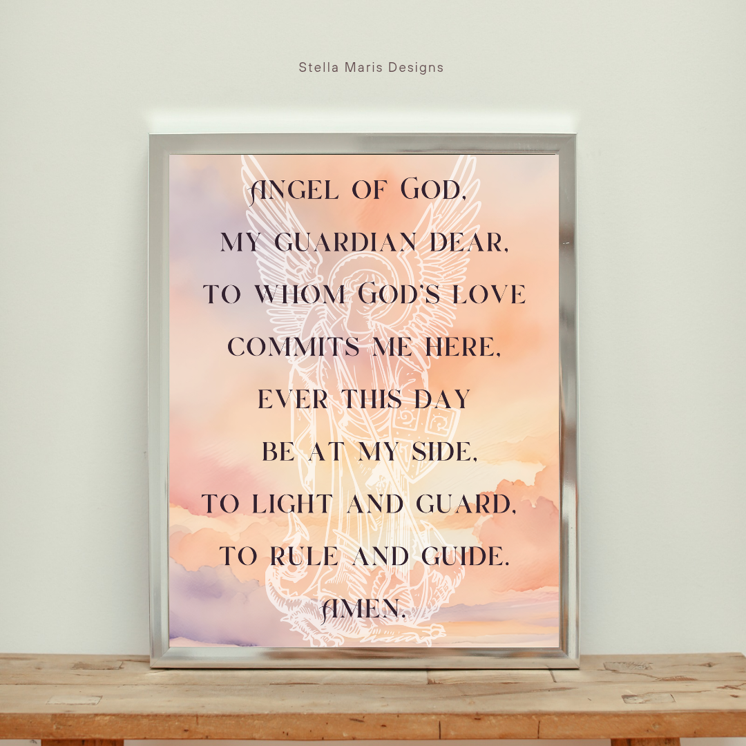 A peaceful watercolor sunrise frames this elegant printable featuring the beloved Angel of God prayer, paired with a soft outline of a guardian angel in the background. A calming, faith-filled artwork perfect for prayer spaces, nurseries, and Catholic home décor.