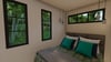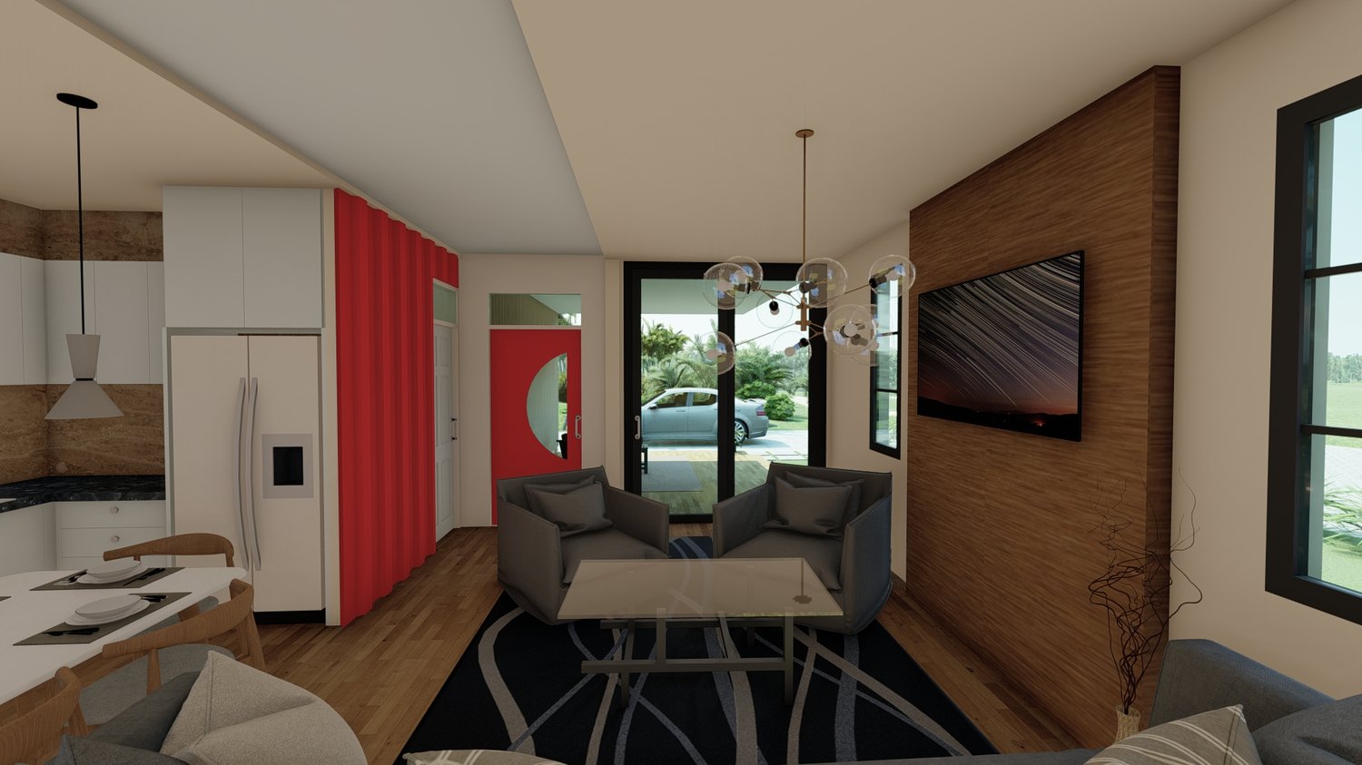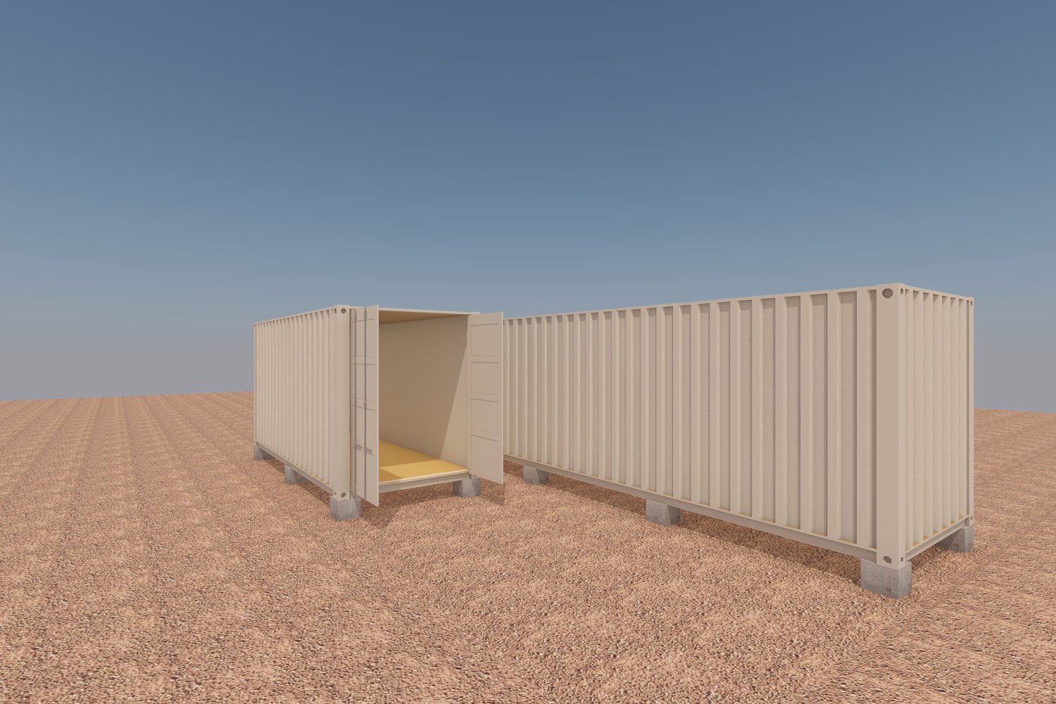 This modern house plan is an architectural masterpiece designed using one 40-foot shipping container and one 20-foot container. The containers are elevated off the ground on a pier foundation to create a modern container floor plan, with one bedroom, one bathroom, and an open-plan living that opens onto a large covered front deck with outdoor lounging perfect for entertaining.