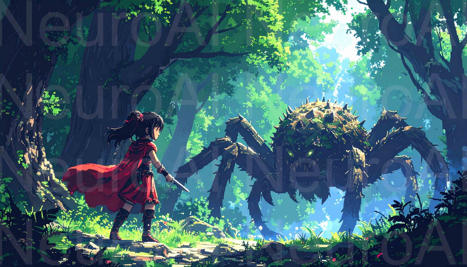 Young warrior faces giant spider in enchanted forest