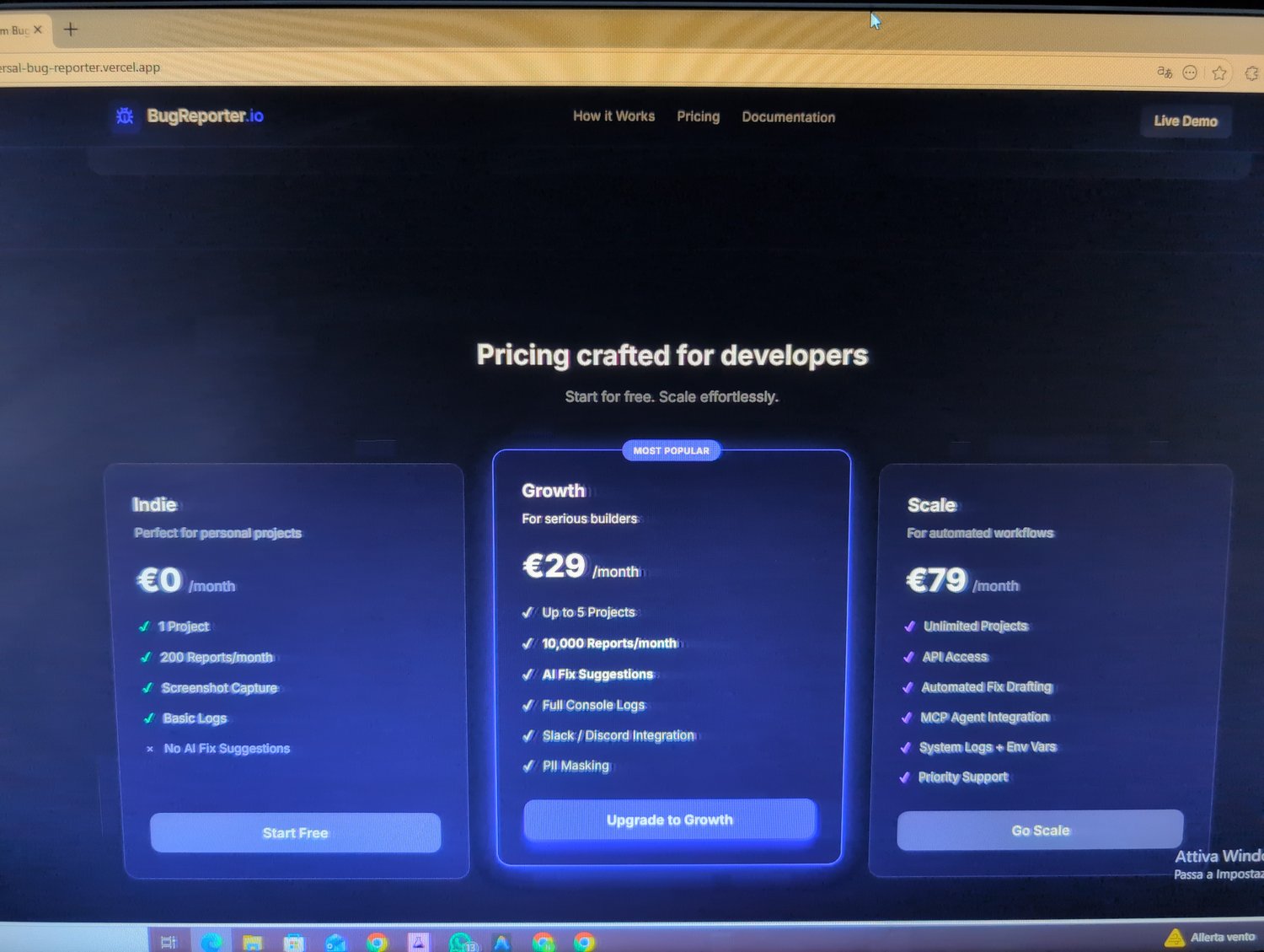 Universal Bug Reporter Growth plan è un abbonamento mensile che sblocca le funzionalità di intelligenza artificiale del nostro widget di debug per sviluppatori.