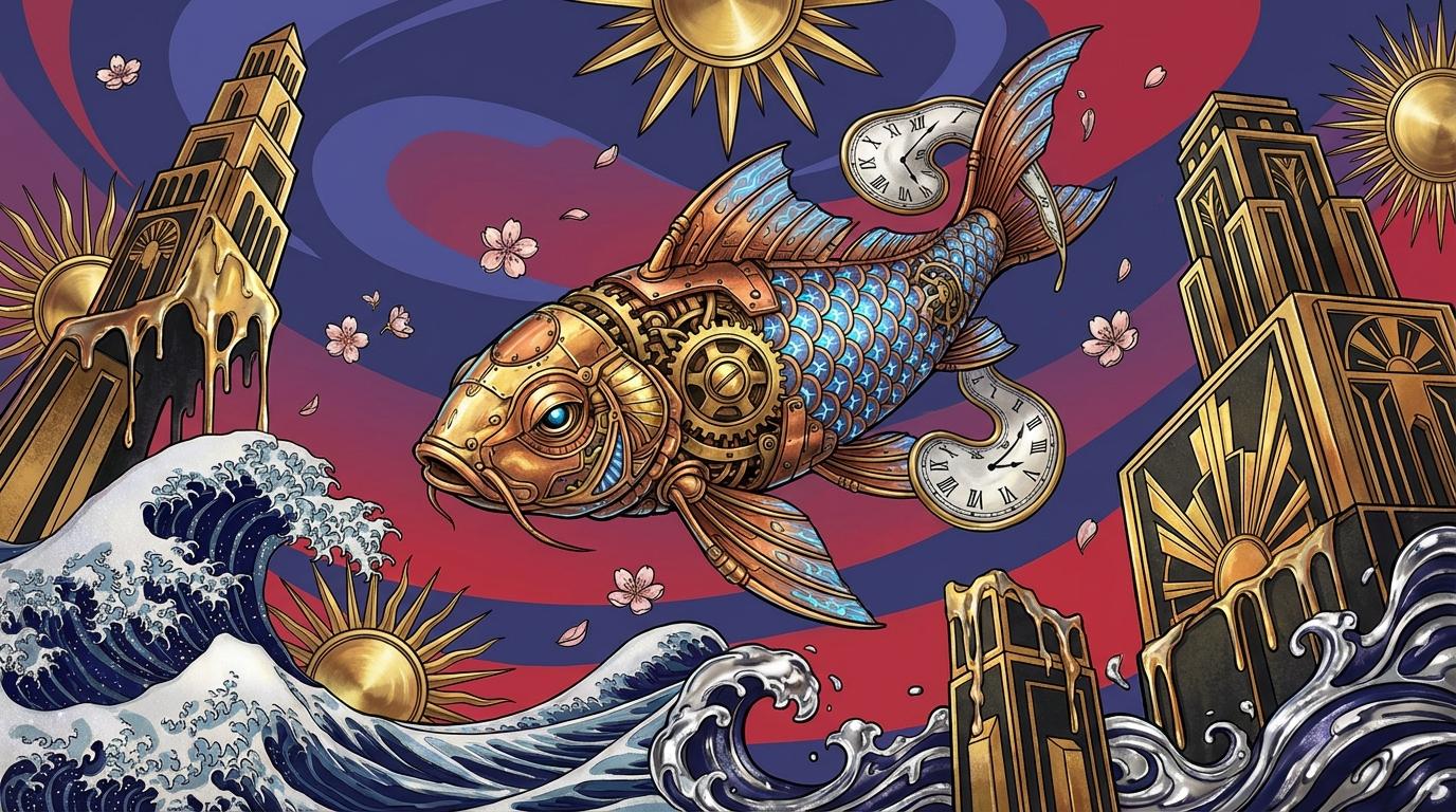The artwork juxtaposes the rigid, man-made geometry of Art Deco skyscrapers with the organic, albeit distorted, forms of marine life and nature characteristic of Ukiyo-e. The Surrealist influence acts as the connective tissue, allowing these disparate timelines and philosophies to coexist in a space where time is liquid and architecture is sentient.