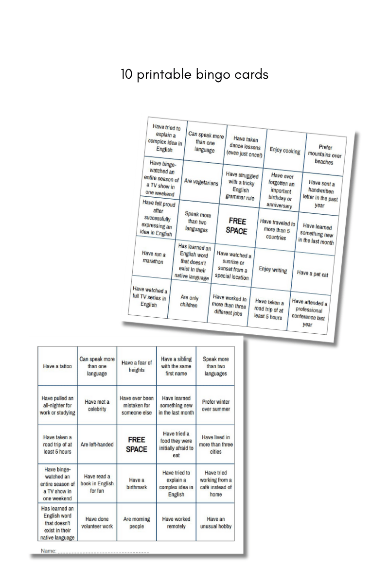 This fun and dynamic Bingo-style icebreaker is designed to help students get to know each other while practicing spoken English in a natural, low-pressure way. Perfect for the first day of class, new group formations, or anytime you want to foster connection and interaction in the classroom.