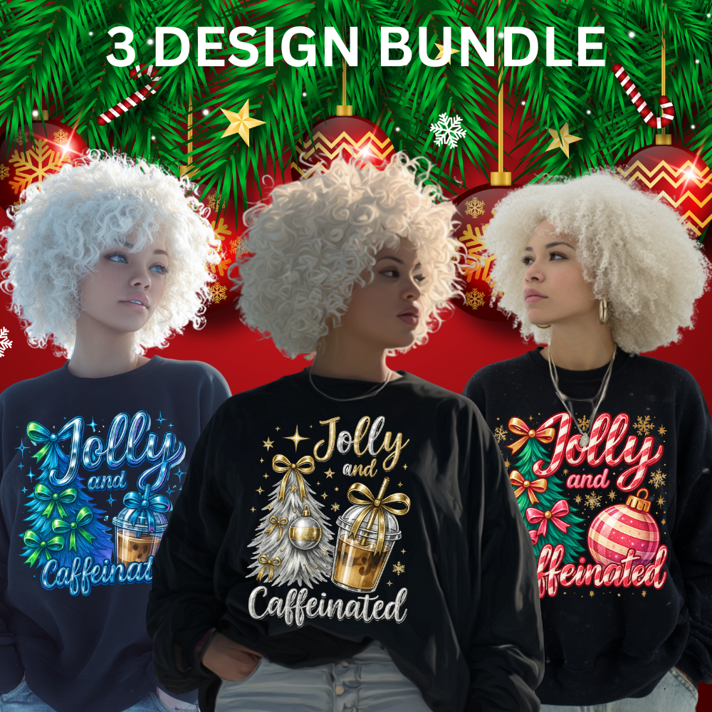 Jolly & Caffeinated Christmas PNG Bundle – 3 Holiday Designs (Red, Gold, Blue)