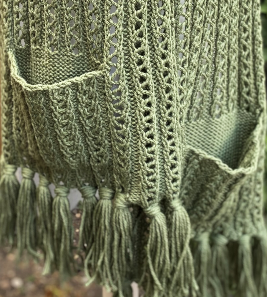 Funaria is knit flat in one piece with integrated pockets. The pattern is written only with no charts. A photo tutorial for making the large tassels is also included.