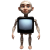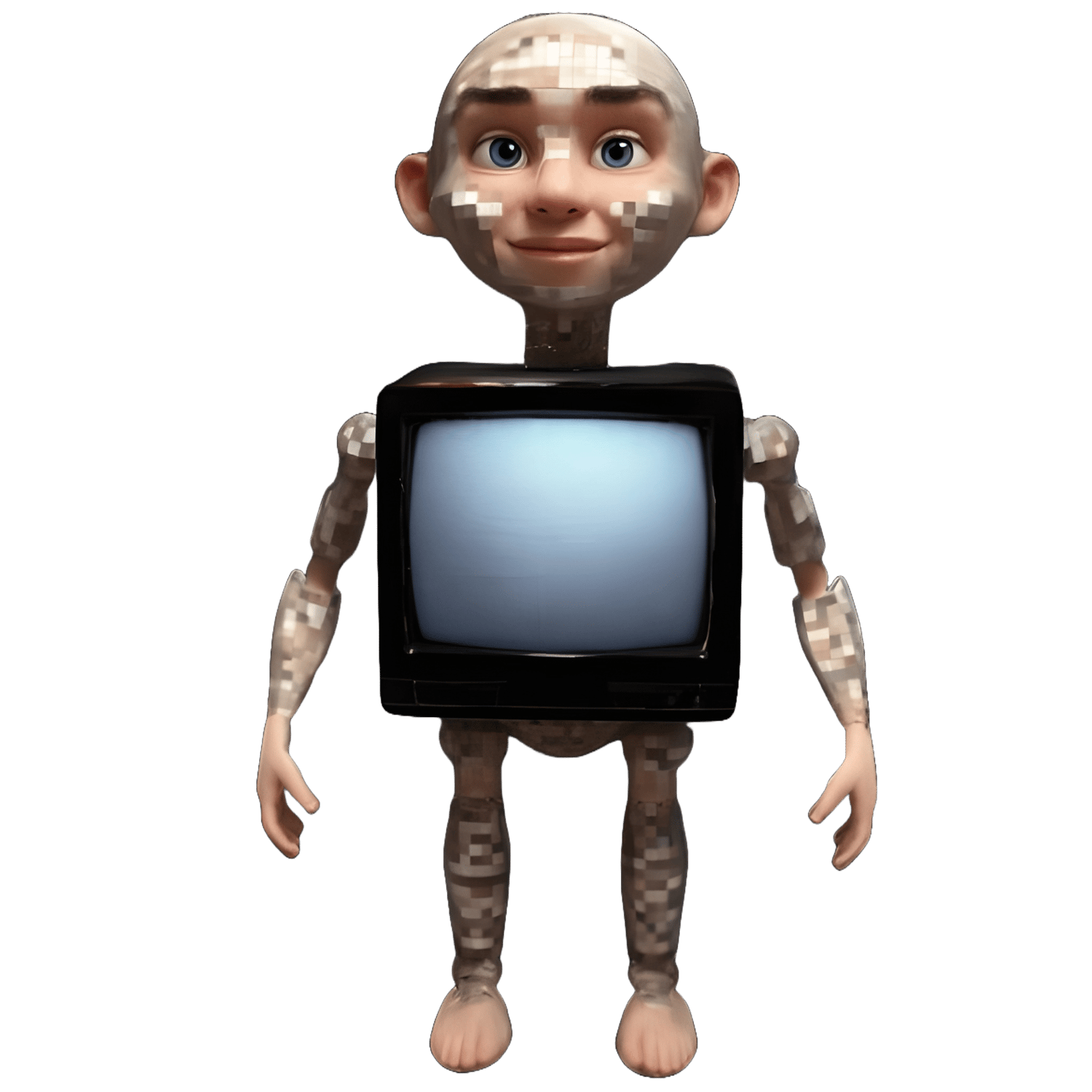 - A whimsical TV-headed character with a humanoid body and pixelated texture details