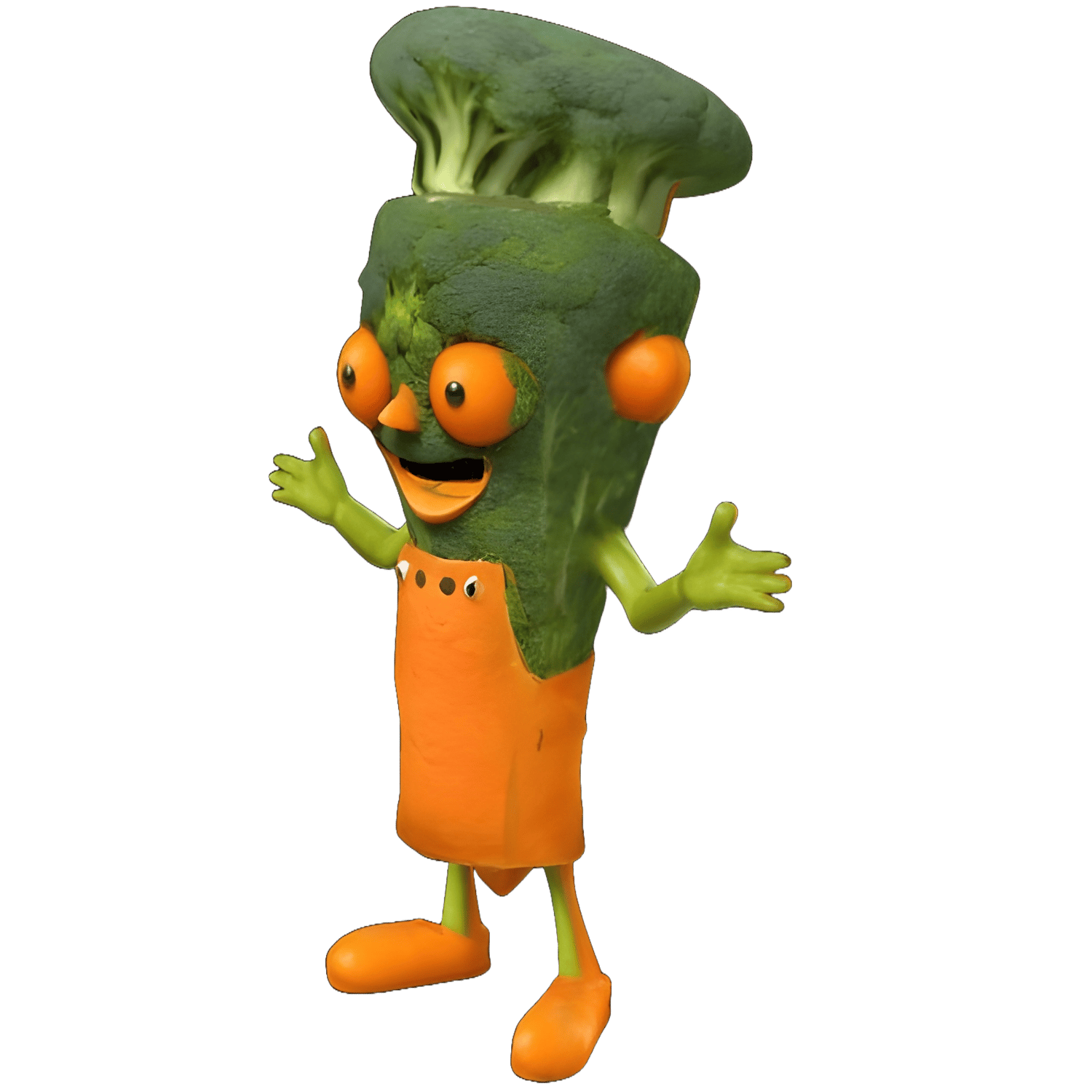 - An adorable anthropomorphic broccoli character wearing an orange outfit