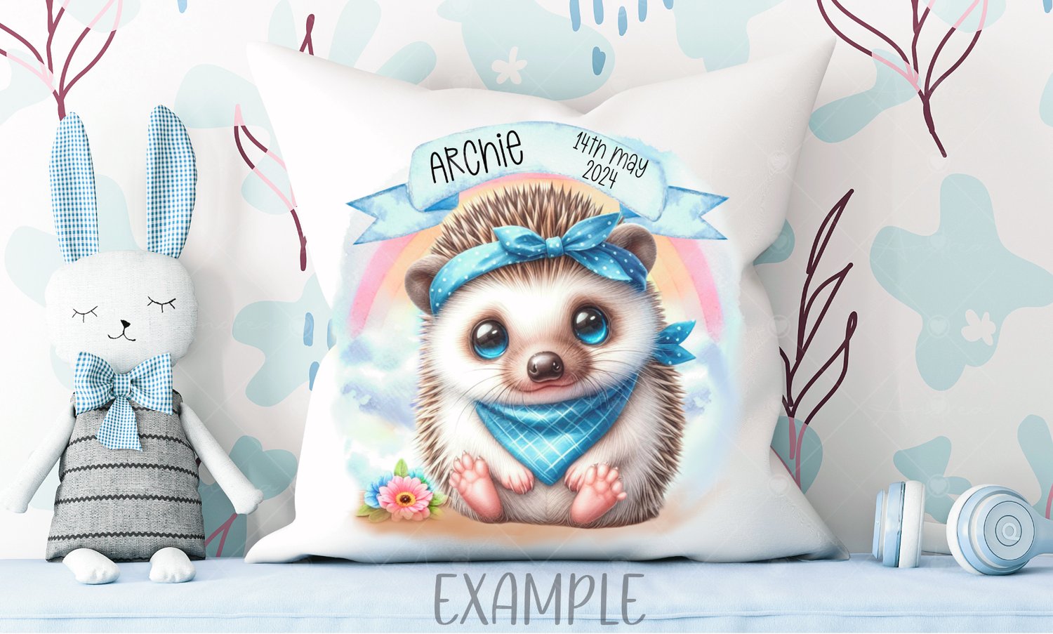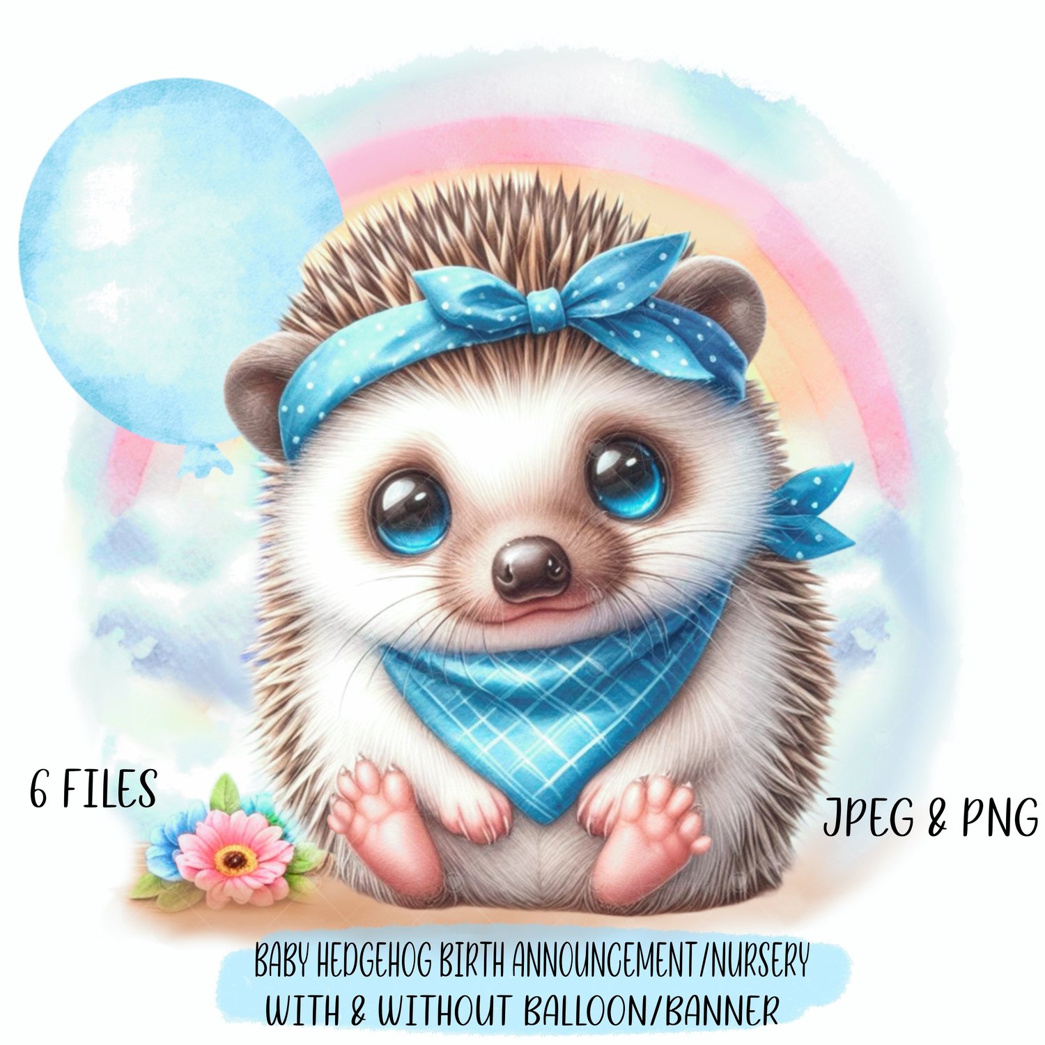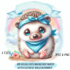 Beautiful newborn baby hedgehog, birth announcement, nursery. 3 styles, balloon, banner, hedgehog only. PNG & JPEG. Sublimation, print. Blue. Ideal for clothing, cups, prints, greetings cards, baby birth announcements, gender reveal etc. 6 files.