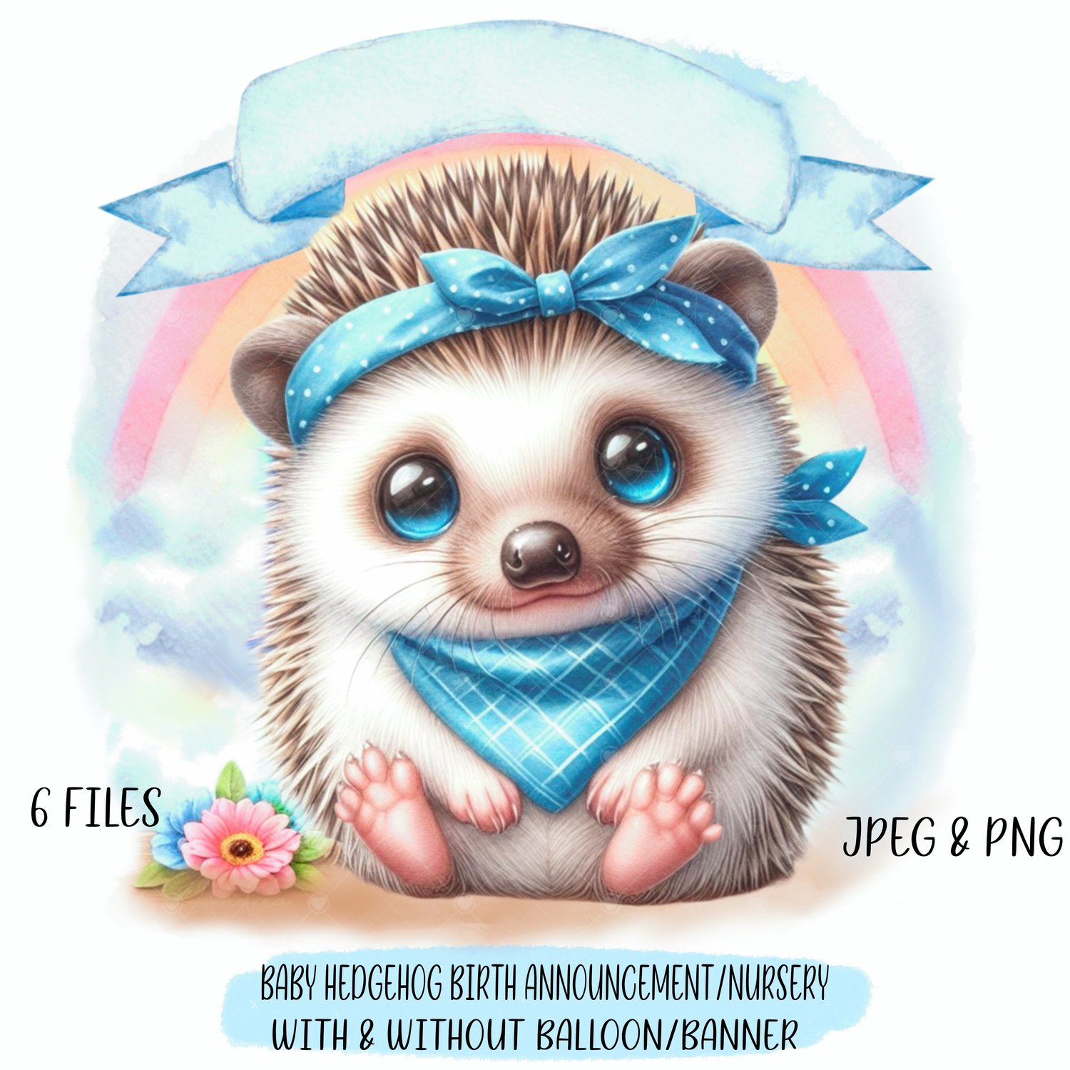 - baby boy hedgehog with rainbow and banner, PNG and JPEG format.