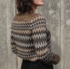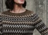 The sample has been worked using Fiber Optic Yarn’s Kashmir base (80% Superwash Merino / 10% Cashmere / 10% Nylon; 384 m / 420 yds per 114 g) in colourways Walnut for Colour 1 (green-brown) and Coffee for Colour 3 (brown-black).