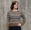 This garment is worked top-down, mostly in the round, with a modified raglan construction. The back of neck and sleeve stitches are cast on first and worked flat whilst beginning the modified raglan shaping and front of neck shaping. Once joined in the round, stranded colourwork is worked whilst the raglan shaping continues. Once yoke depth is reached, the yoke stitches are separated into body and sleeves, each of which are worked in the round, continuing the stranded colourwork pattern. Stitches for the neckband are picked up and worked in half-twisted ribbing to match the waistband and cuffs. The lower body and sleeves are worked in plain stockinette and finished with half-twisted ribbing.