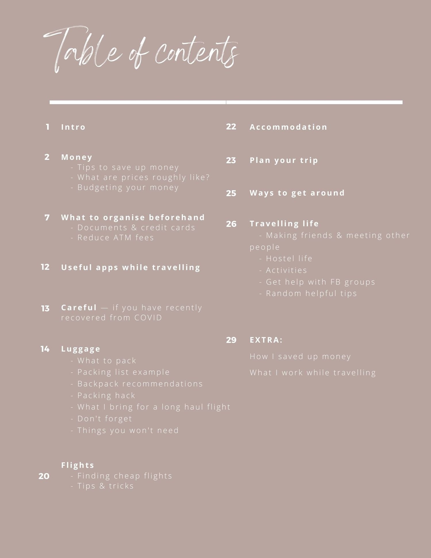 I bet you are excited for your upcoming trip, I promise you, after reading this travel guide you will definitely not feel so lost anymore, and know everything you need to know to get yourself around. I decided to create a travel guide because after years of travelling to more than 23 countries, I learnt so many tips & tricks that I wish I knew when I first started travelling! I want to make your life easier and share these with you over the next 31 pages. I will share with you how to save up money, how to find cheap flights, what to bring, what to watch out for, the easiest way to travel around and much more!