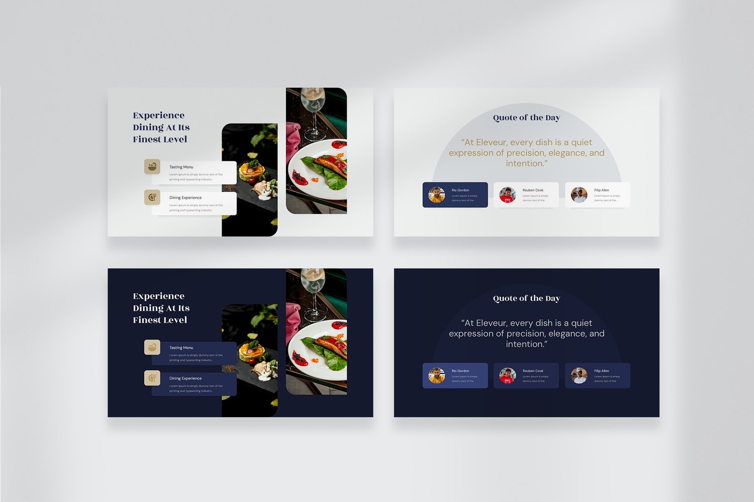 Eleveur is a luxury food and restaurant presentation template designed with refined elegance and modern aesthetics.