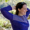 Seamless construction: knit in the round from the bottom up. The body is split at the underarm bind offs, from whence the front and back are worked flat separately with optional stripes. Then the shoulders are joined with three needle bind off. Set-in top down sleeves are also worked seamlessly with optional stripes. Faux side seams with cables run from the rolled hem to the underarm bind offs and continue back down the sleeves to the rolled cuff mirroring the body.