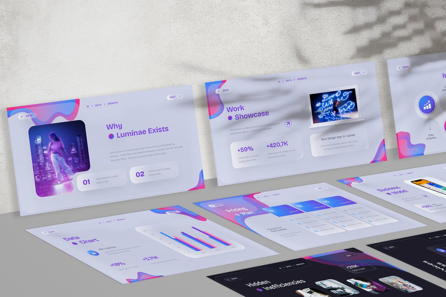 Luminae is a modern SaaS startup pitch deck designed with a sleek liquid glass style and clean interface system.