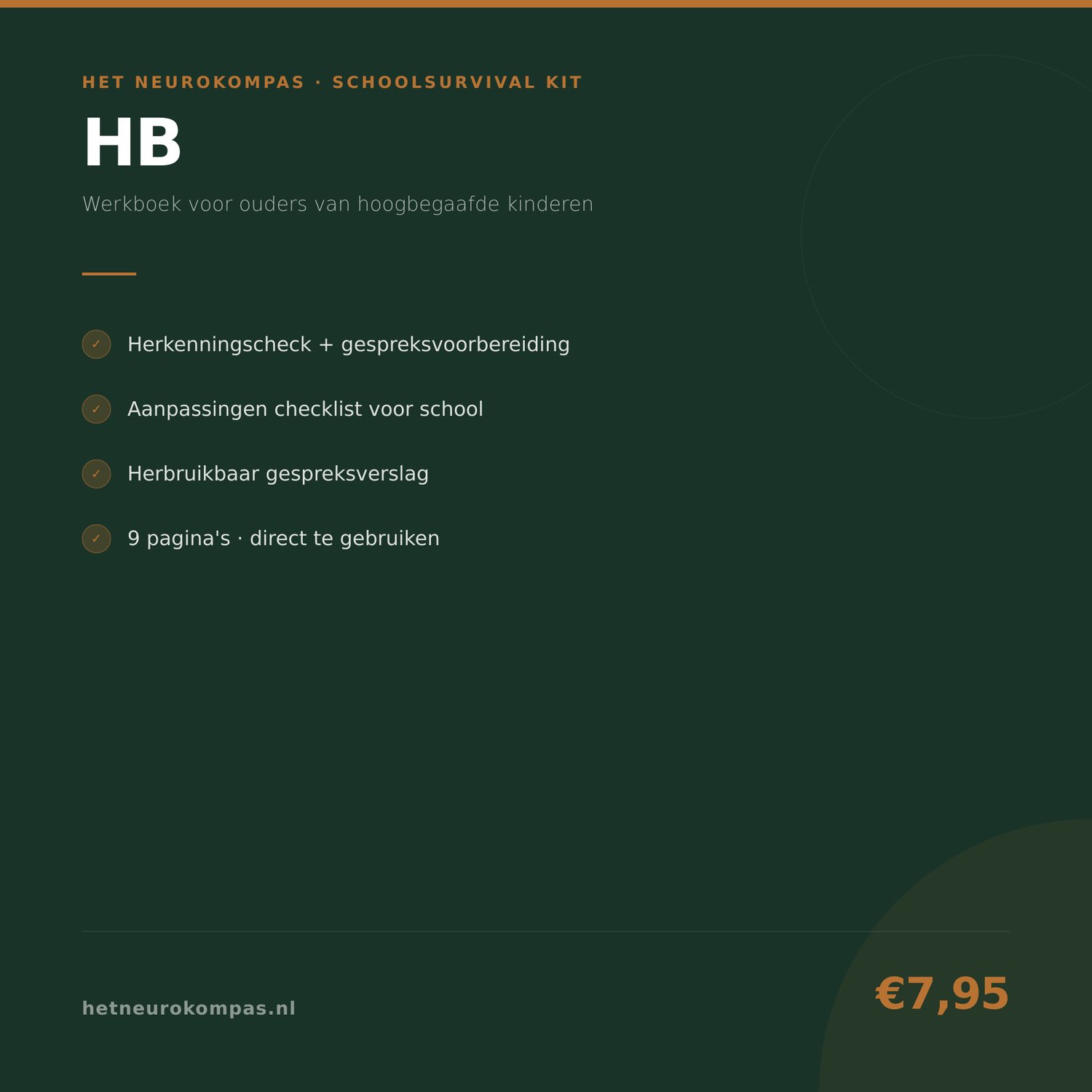 Deze Schoolsurvival Kit begeleidt je stap voor stap: van het herkennen van de signalen van hoogbegaafdheid, via de voorbereiding op een gesprek met school, tot het vastleggen van afspraken en escaleren als dat nodig is.