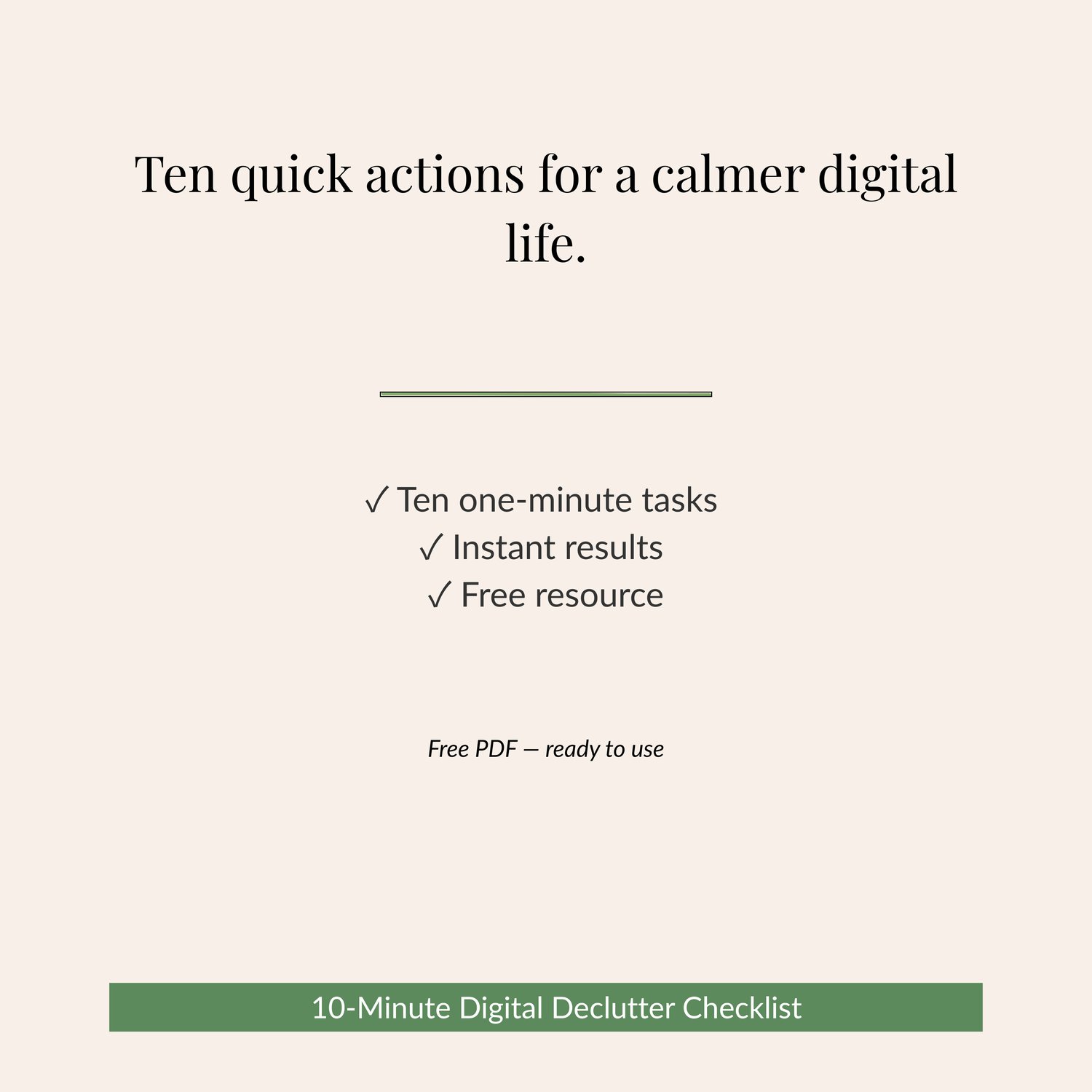 A free, one-page checklist with ten quick actions you can take right now to start decluttering your digital life. Each task takes just a minute — but together they'll make an immediate difference to how calm and organised your digital space feels.