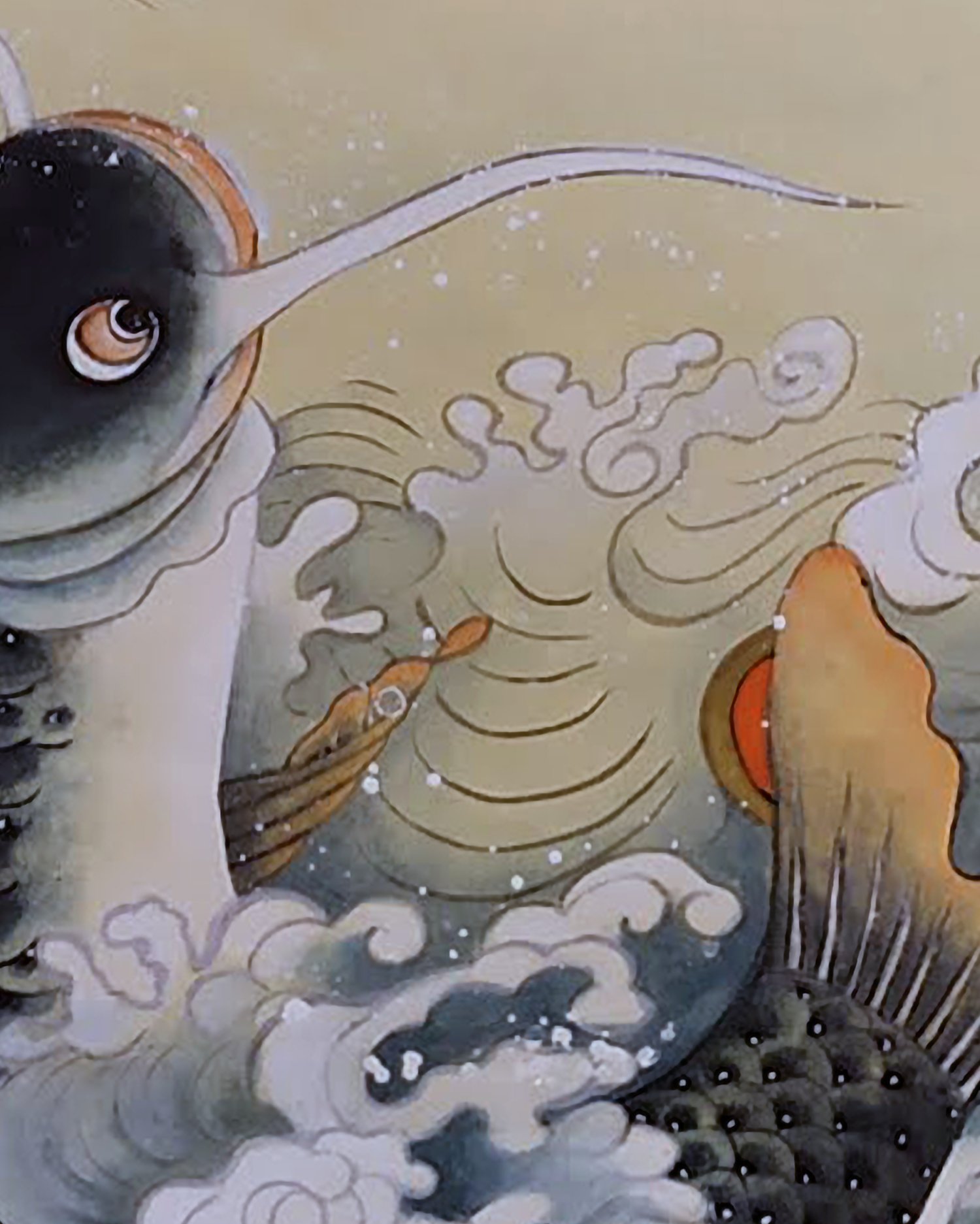 In folk paintings, fish paintings contain the honest and simple dreams of the people who tried to achieve their realistic desires. The picture of a carp kicking and jumping out of water is called 'Eobyeon Seongryongdo'. This is compared to the appearance of a carp springing up and turning into a dragon, in the past, passing the state examination and becoming a government official.