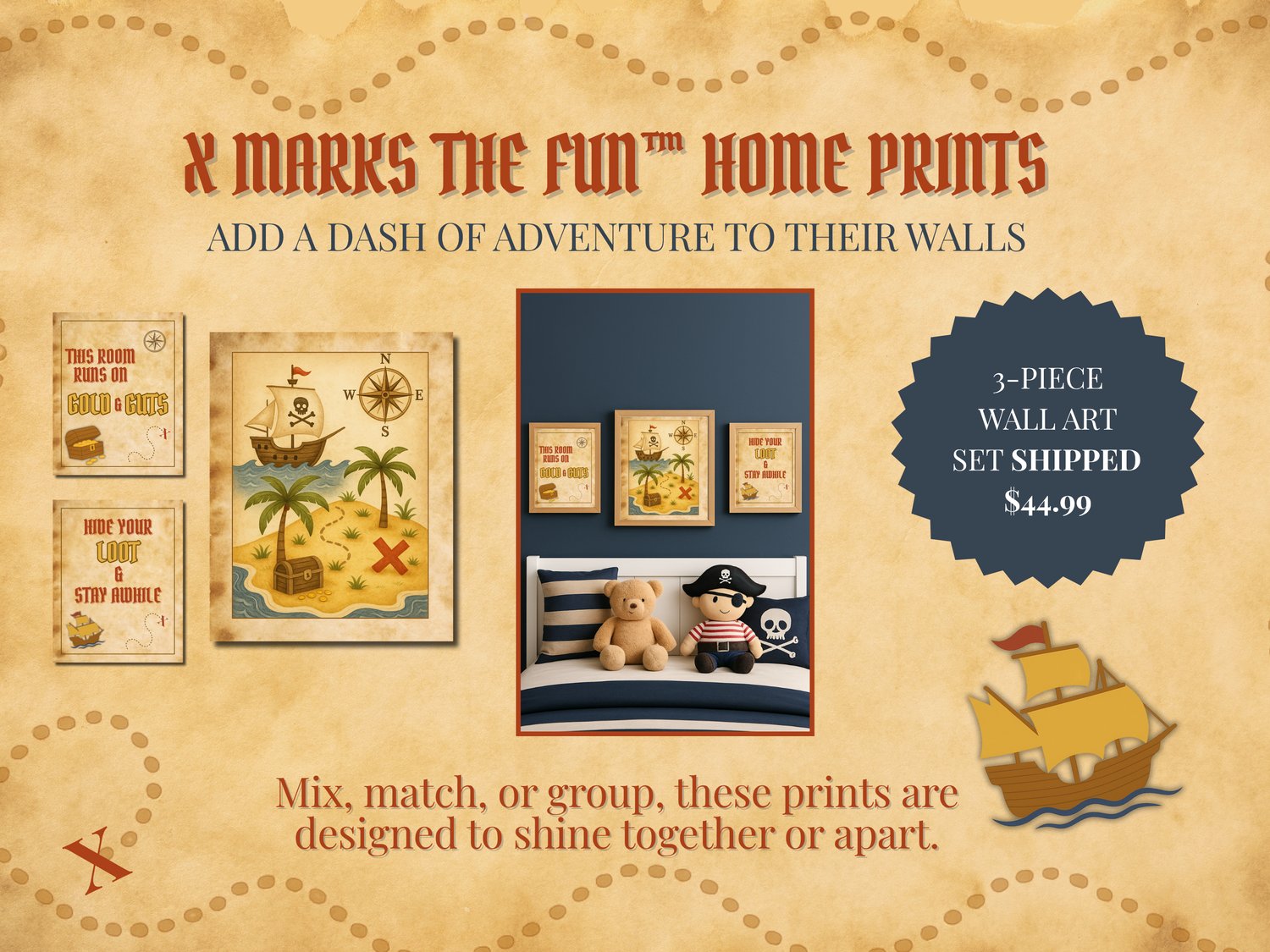 Pirate-Themed Wall Art for Boys – X Marks the Fun 3-Piece Set | Rolled Poster Prints Shipped to You – Nautical Adventure Room Decor