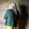 Thelma is worked seamlessly from the top down, beginning with the back of the collar. Stitches are then picked up to work the back, shaping the shoulders with short rows. Next, stitches are picked up from the back shoulders to work the fronts, which are joined with the back at the underarm to continue the body in