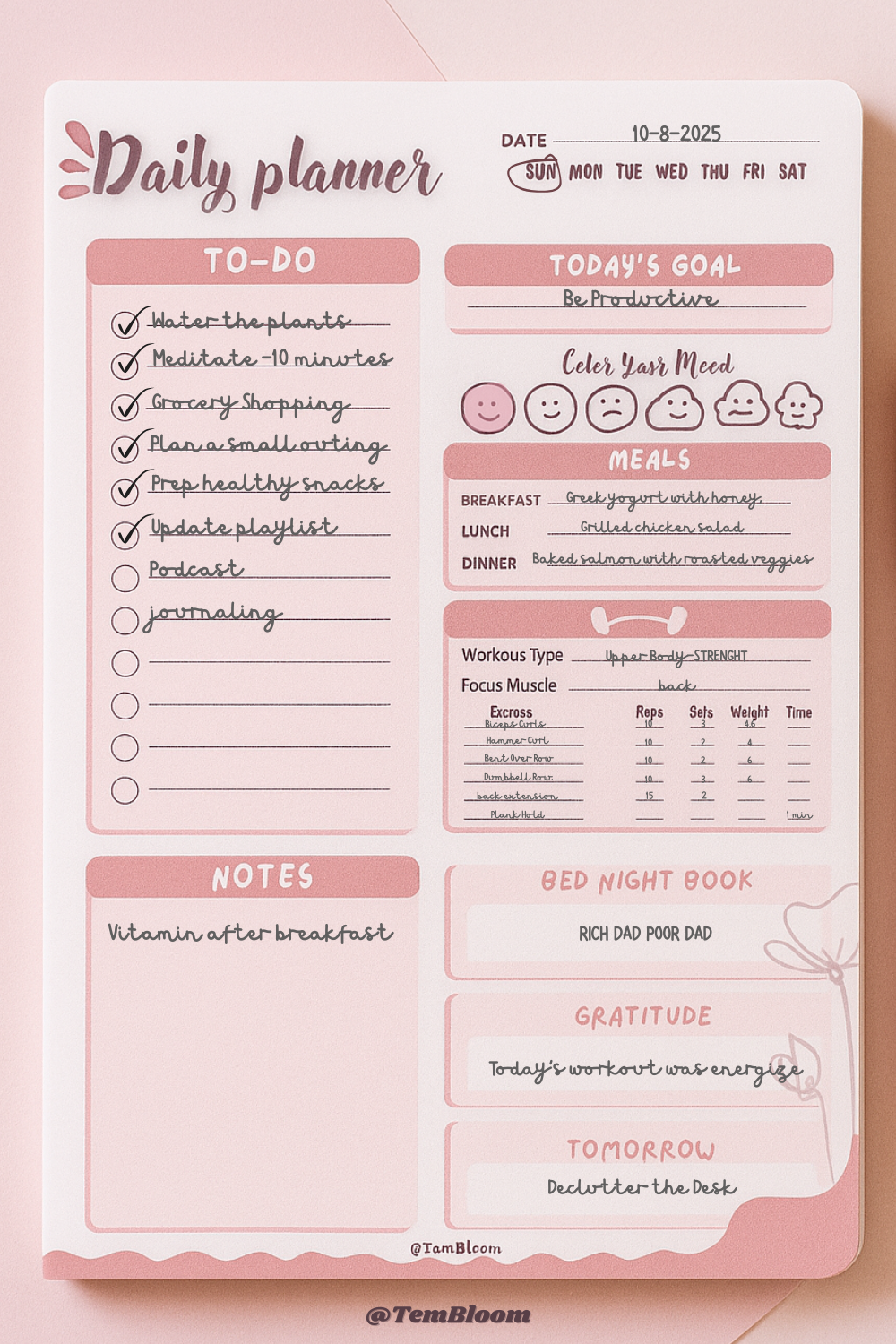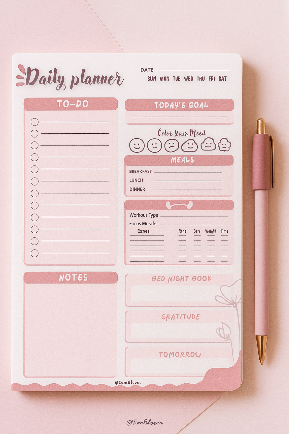 Blush & Bloom Daily Planner – A minimalist, pastel-toned planner designed to keep your days organized and inspired. Featuring soft blush accents, spacious sections for to-dos, priorities, and notes, this planner blends functionality with a calming aesthetic. Perfect for staying productive while enjoying a beautiful, clutter-free layout.