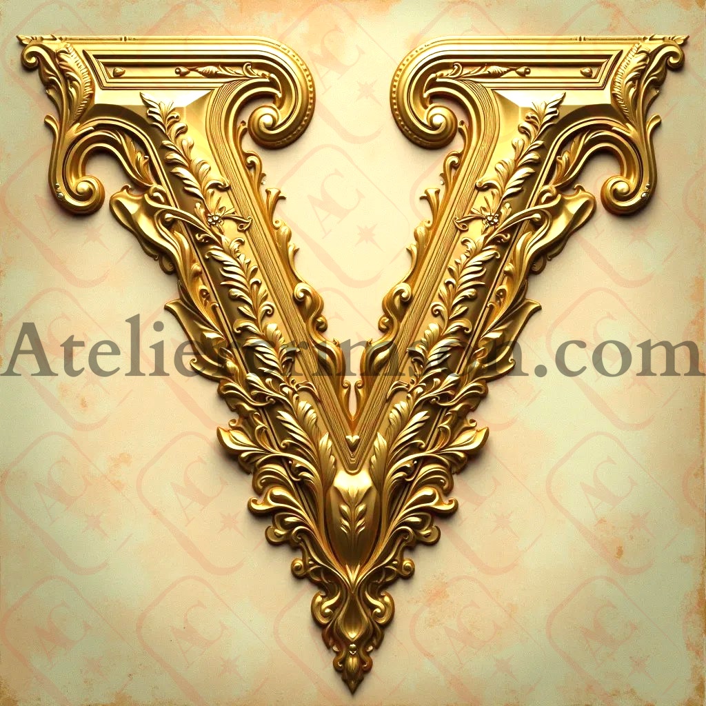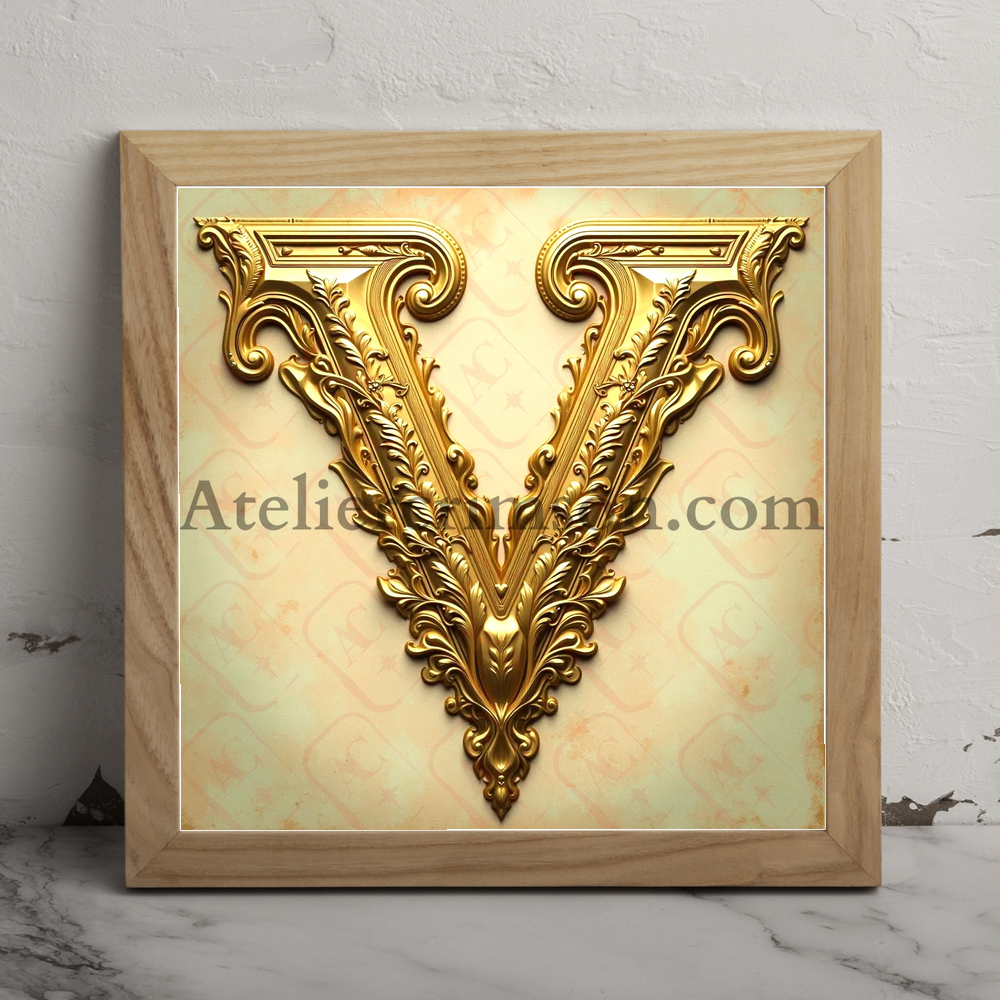 The letter V gold metal art nouveau Download Now this high quality AI-generated image, perfect for adding a touch of tranquility and creativity to any space.