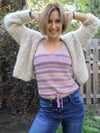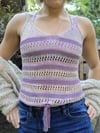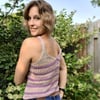 This flirty, cropped-length tank top features easy lace worked top down on a stockinette background alternating with garter stitch stripes. The body is finished with a cinched tie at the bottom shaped using short rows. The straps are shaped using stockinette stitch with a garter border. The Stripe Me Down Tie Me Up tank features classic construction with an interesting twist!