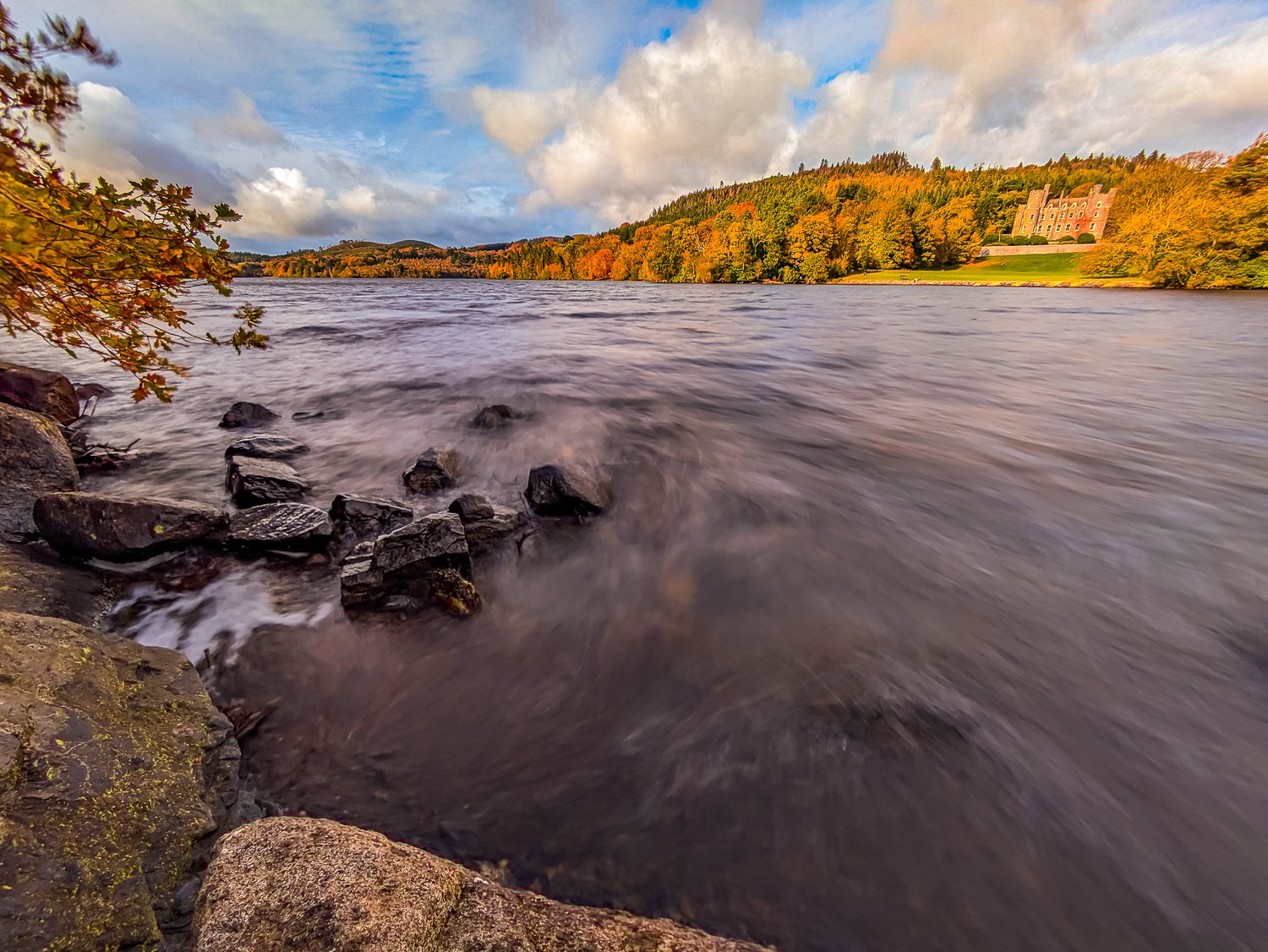 Taken along the edge of Castlewellan Lake, this image captures long-exposure water in motion beneath a sky of passing cloud, with autumn woodland glowing on the far shore. The castle sits quietly in the distance, adding a sense of place and history.