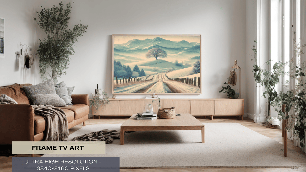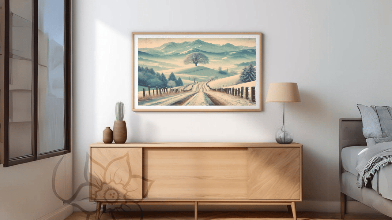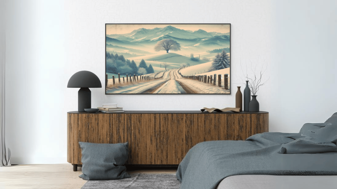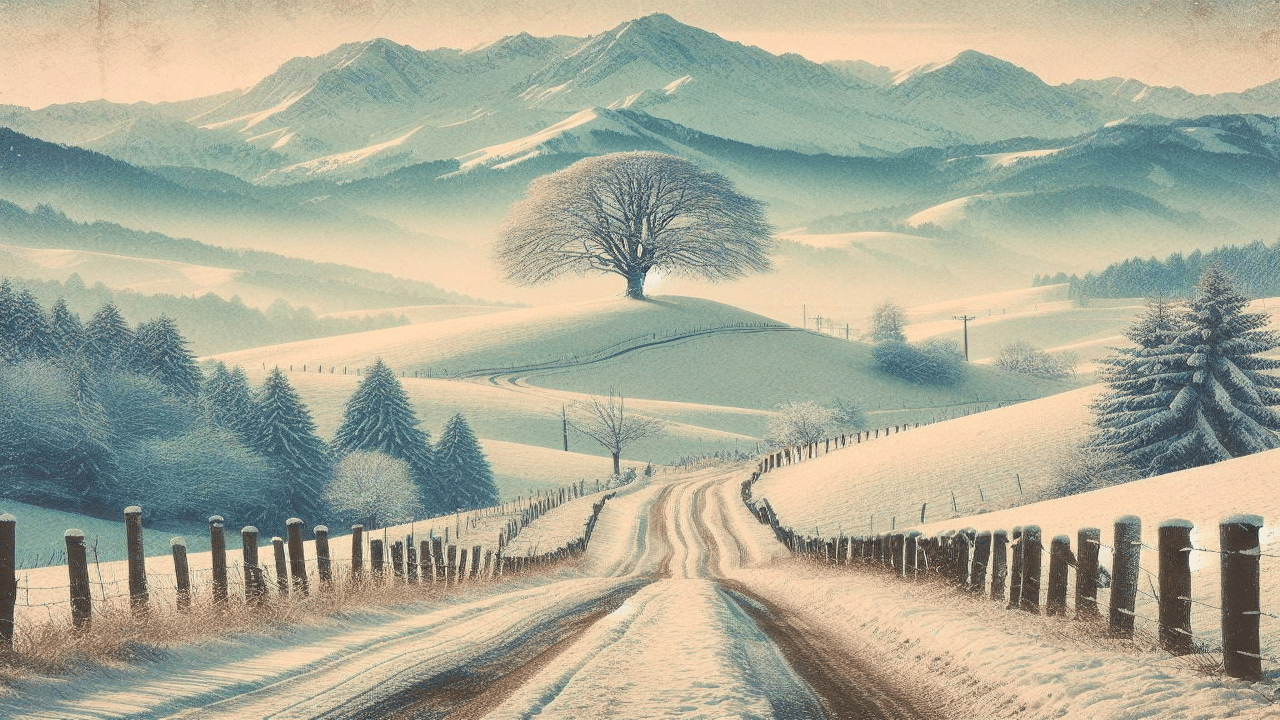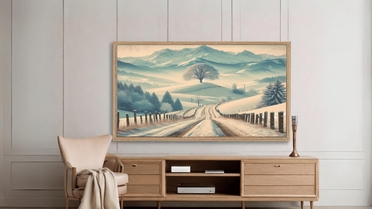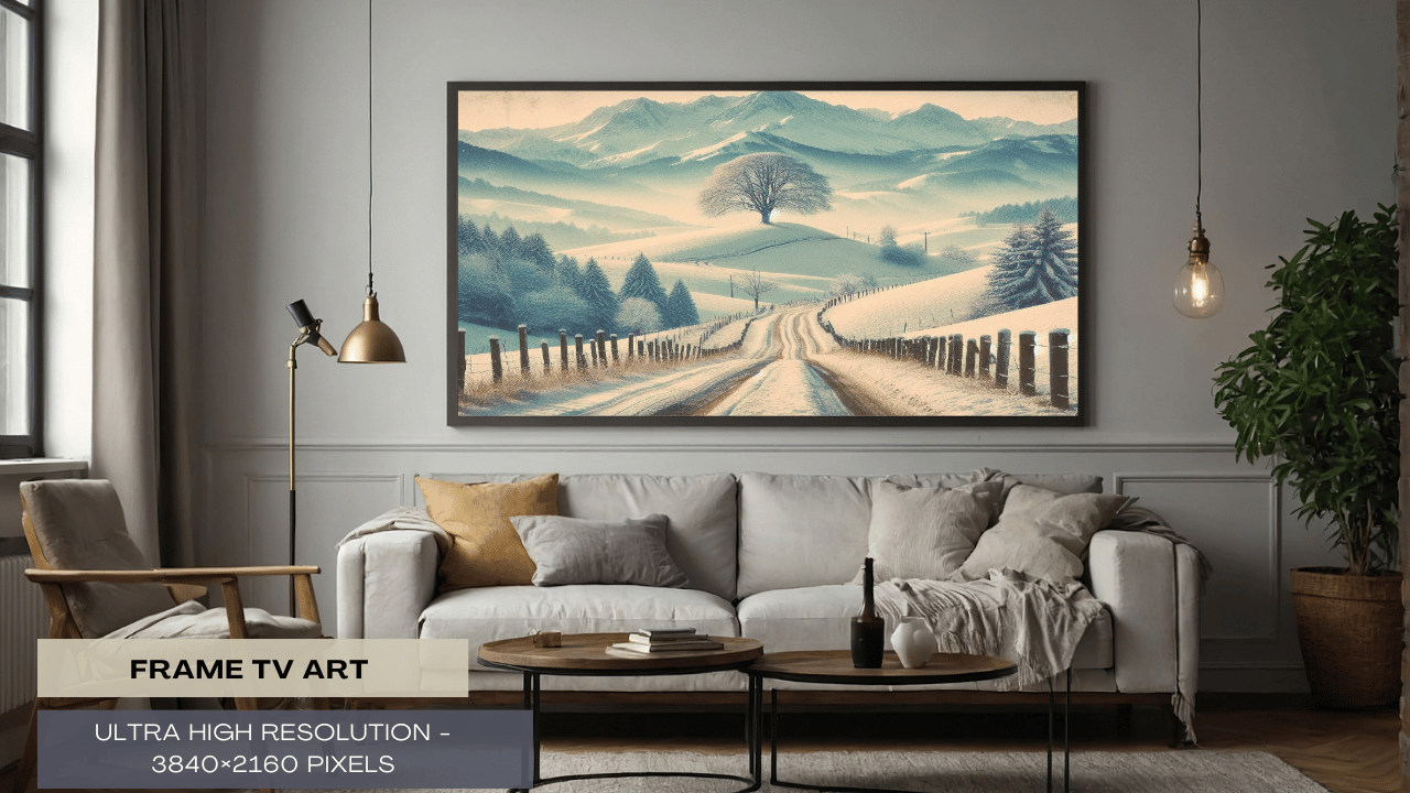 Enjoy the serene beauty of winter with this lovely digital artwork that shows a serene snowy road flanked by a lone, stately tree. This piece will infuse any space in your house with a sense of wonder and peace.