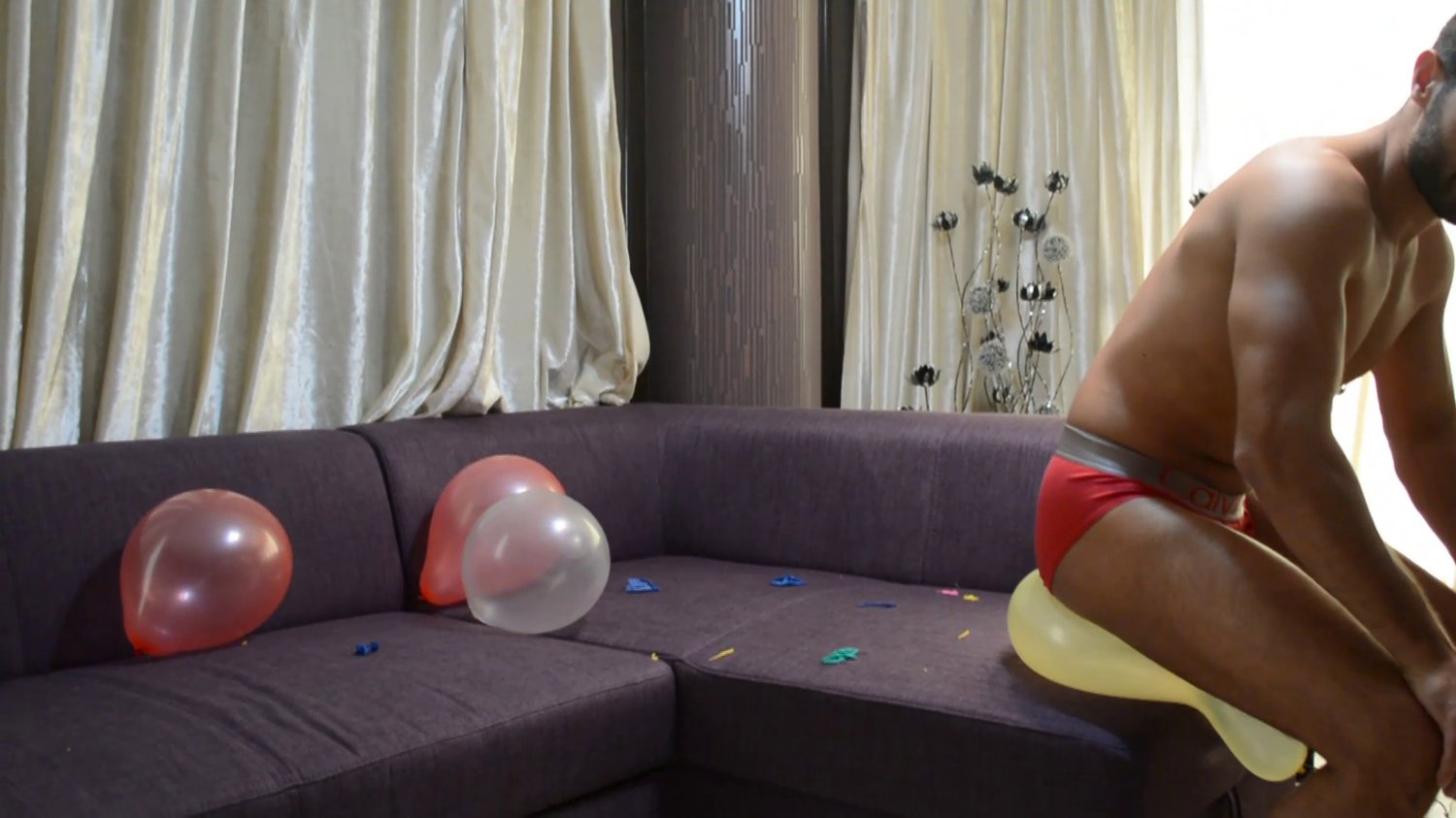 After having so much fun working out and popping balloons, Victor decides to try to pop them by sitting on them in briefs!