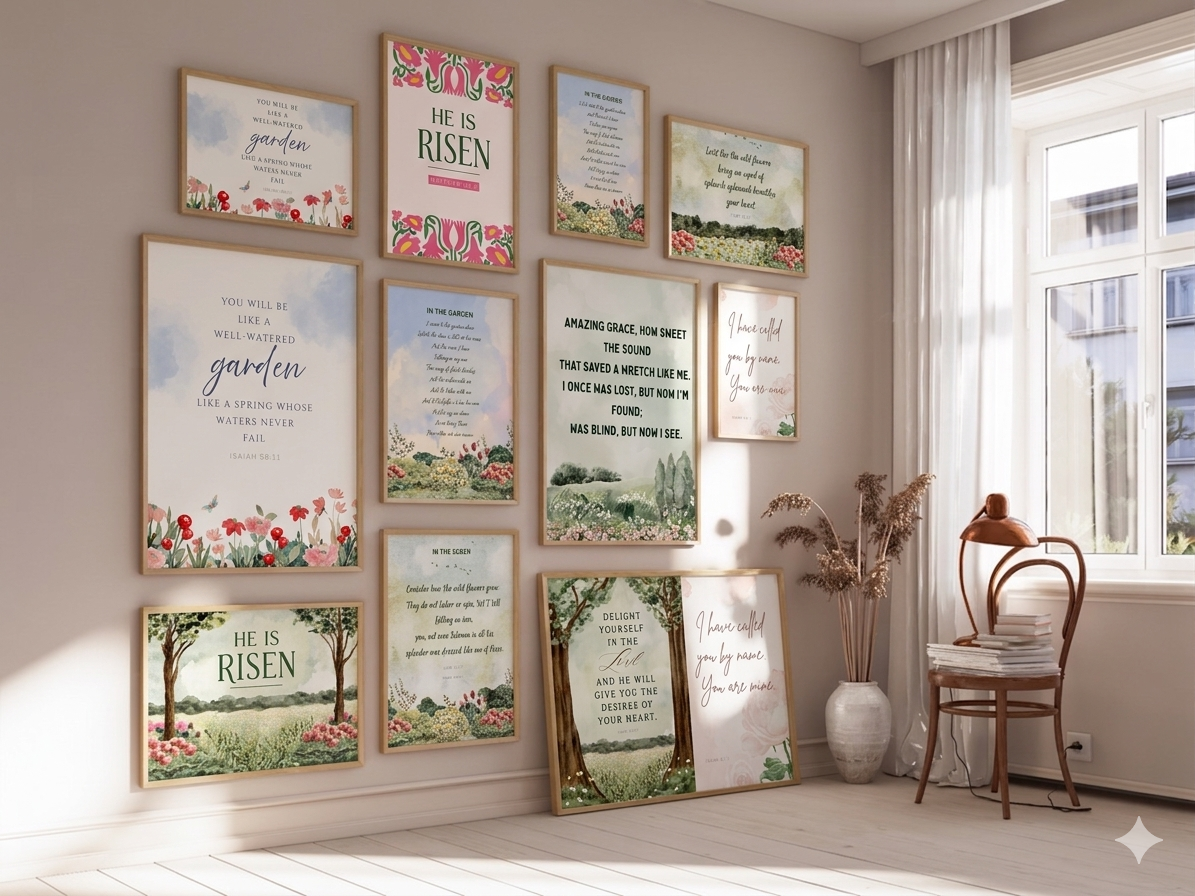 Designed with soft, hand-painted watercolor landscapes, florals, and calming neutral tones, this collection brings encouragement, hope, and truth into your everyday spaces.