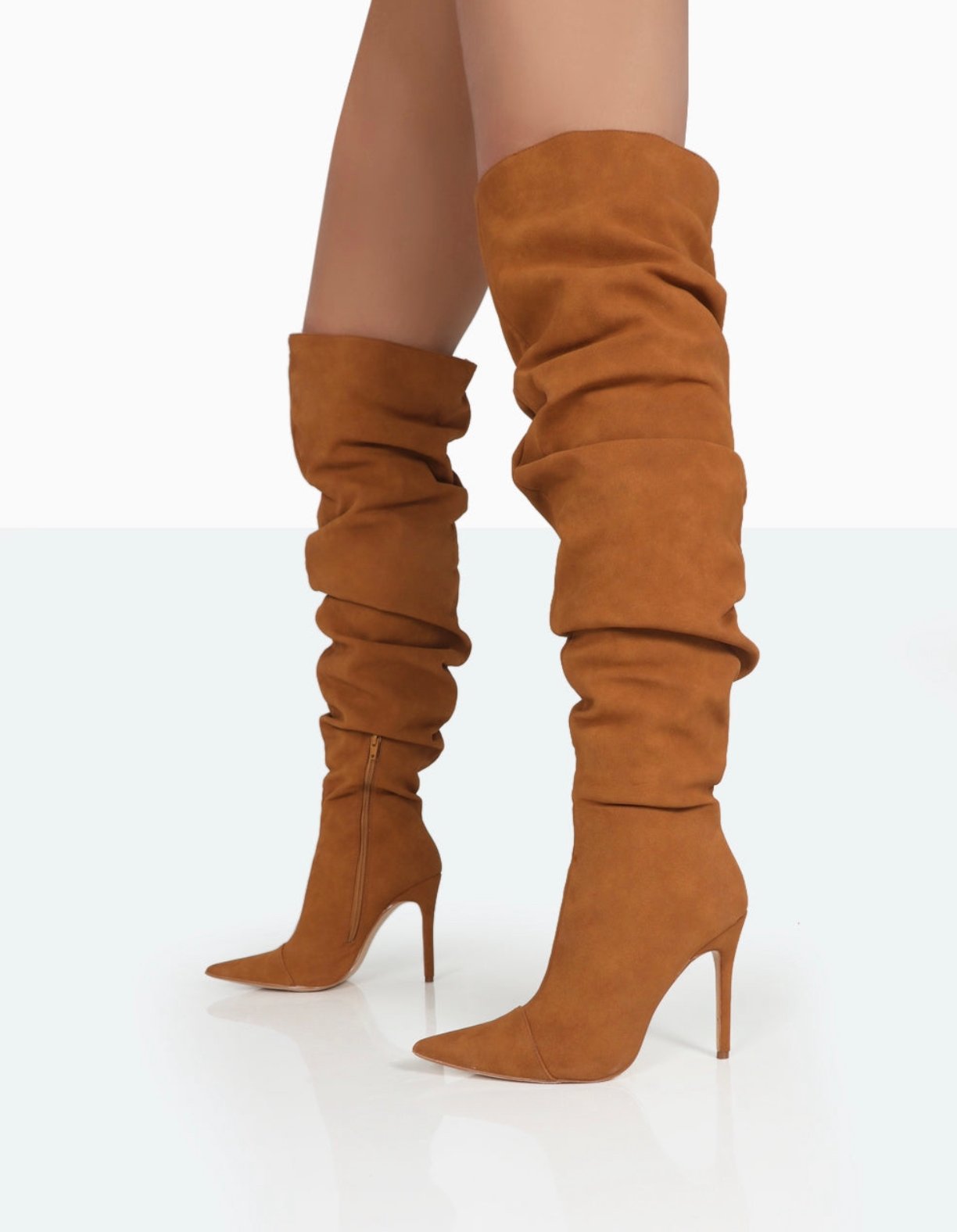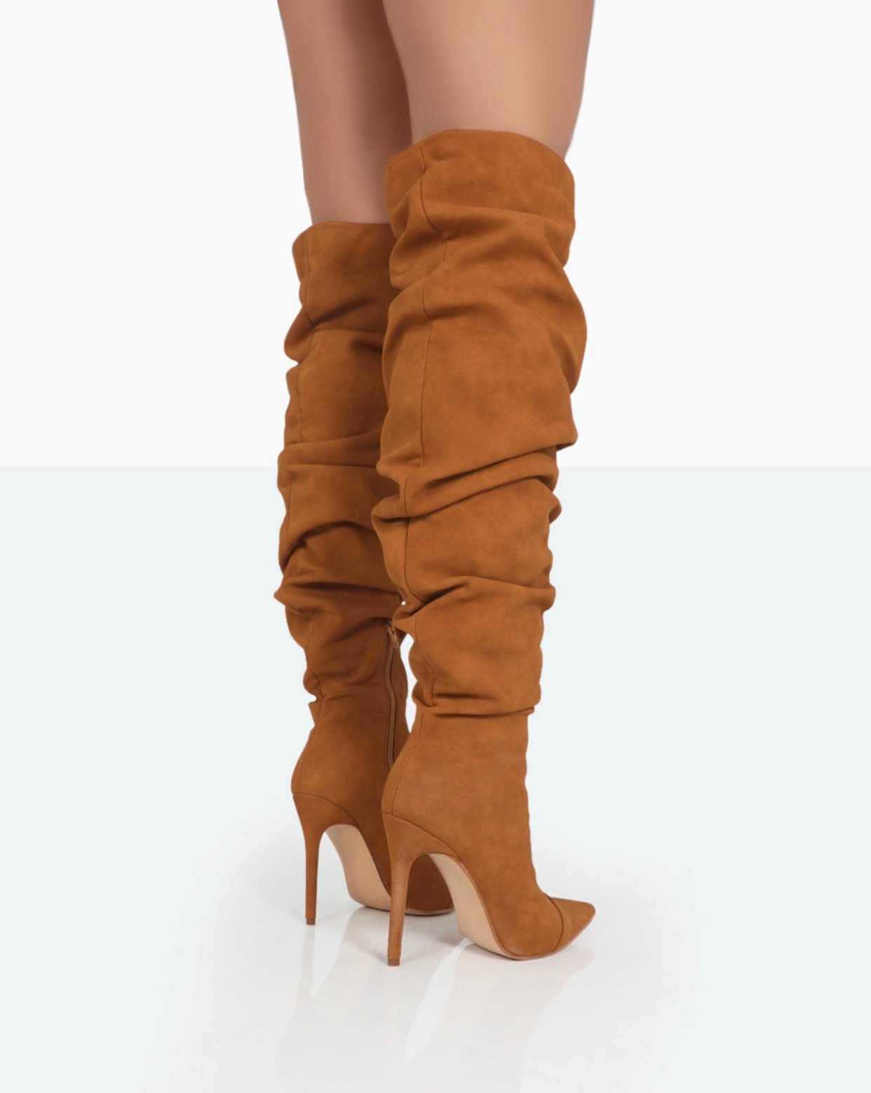 TAN FAUX SUEDE POINTED TOE STILETTO OVER THE KNEE BOOTS