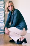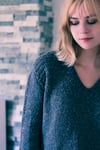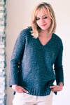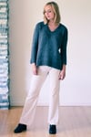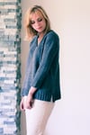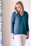 Construction: Ikinngut is cast on at the back, the shoulders are shaped with a few short rows, then the back yoke is worked in a textured broken basket rib stitch pattern. The back is put on hold while stitches are picked up for each front shoulder and worked similarly to the armscye depth, with deep V front neck shaping. Back and fronts are united and fullness is added at the empire line with rapid increases creating gathers, then the body is worked in stockinette in the round to the split hem, which is worked back and forth in K2P2 rib. Slim, three-quarter length sleeves begin with picking up stitches around the armholes, then the caps are shaped with short rows, and the sleeves are worked seamlessly to the long textured cuffs. Stitches are picked up around the neck and a narrow garter neckband is worked, with a mitered V to maintain the shape of the neckline.
