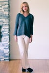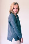 Yarn: Green Mountain Spinnery Cotton Comfort (80% fine wool, 20% organic cotton; 180 yards/165m/58g), shown in Storm 8651; 5 (6, 7, 7, 8, 8) skeins, or approximately 900 (1000, 1100, 1200, 1300, 1400) yards of DK weight wool/cotton or wool yarn.