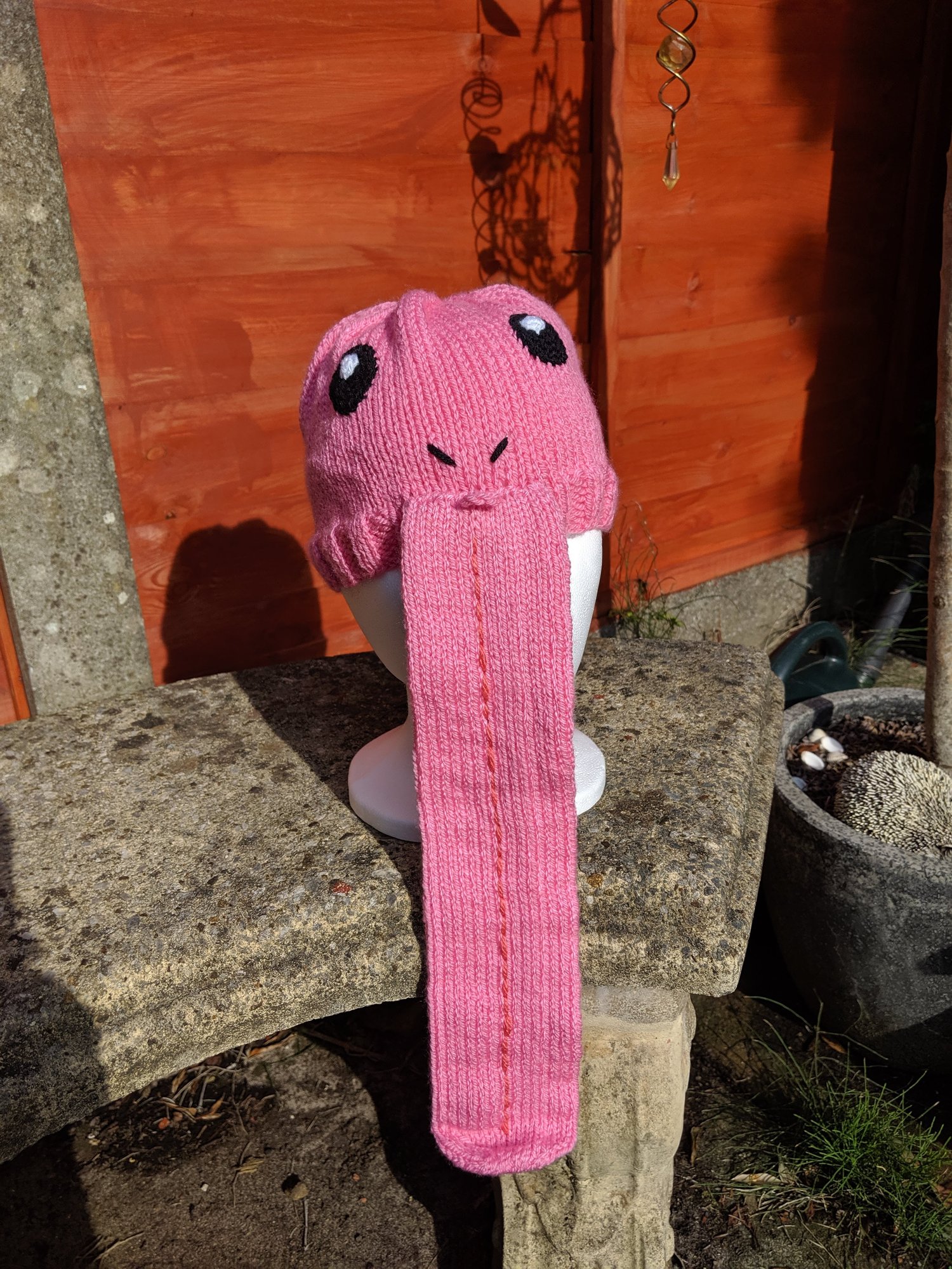 The pattern is mainly knitted in the round, with double pointed needles to knit the tongue.