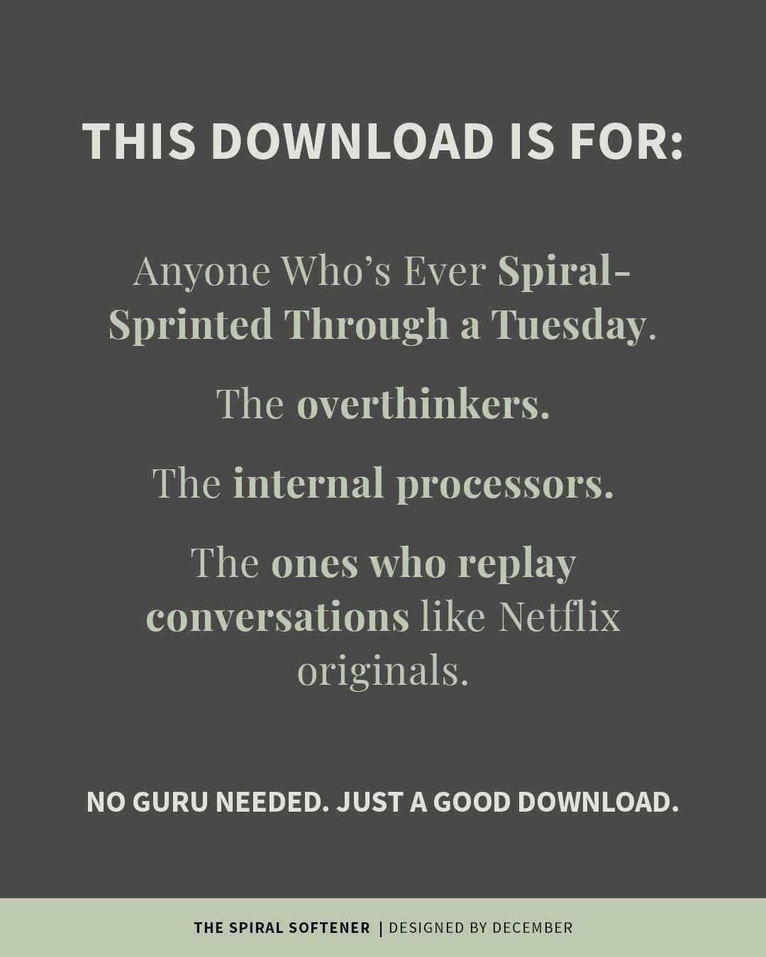 Whether you're stuck in a thought loop or mid-spiral over a text that never got a reply, this cheeky-yet-soothing download walks you back to clarity without shame, fluff, or guru vibes.