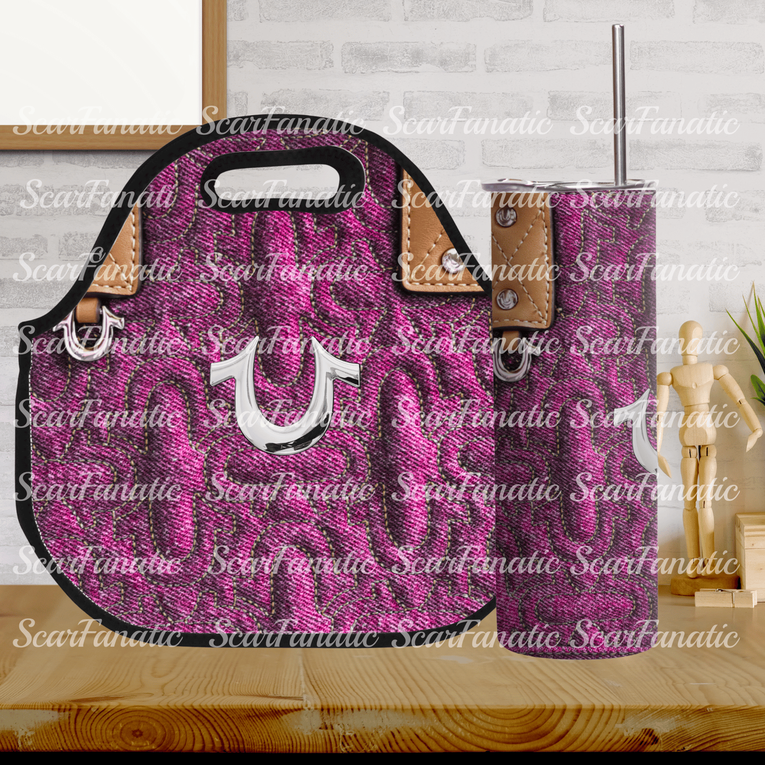Pink Denim and Silver 3D T Rlgn 20oz Tumbler and Lunch Tote PNG Design Bundle