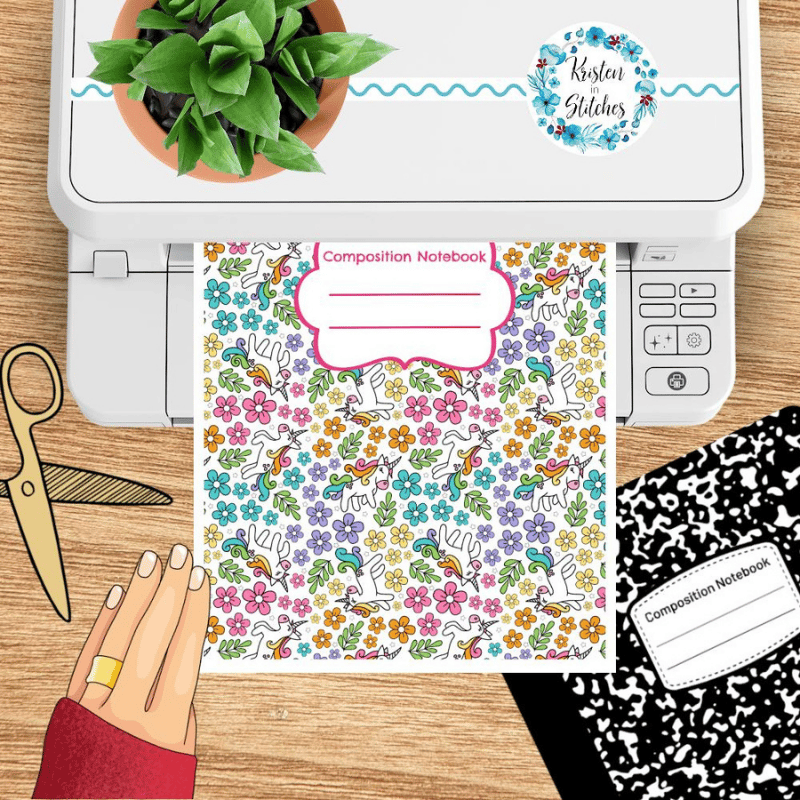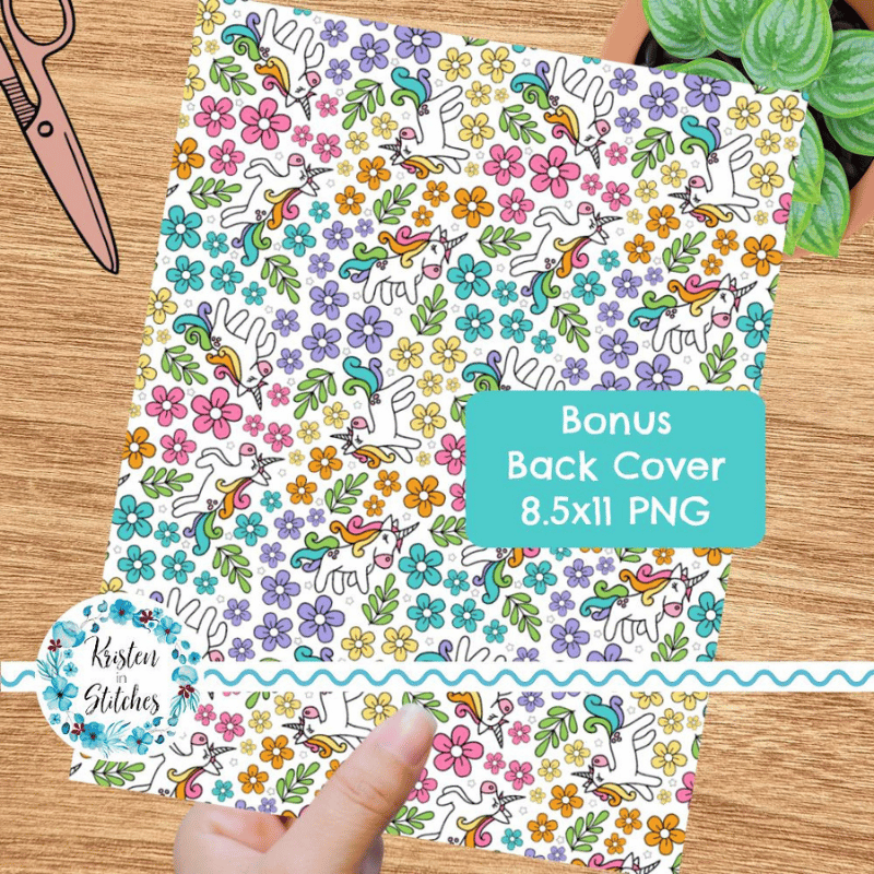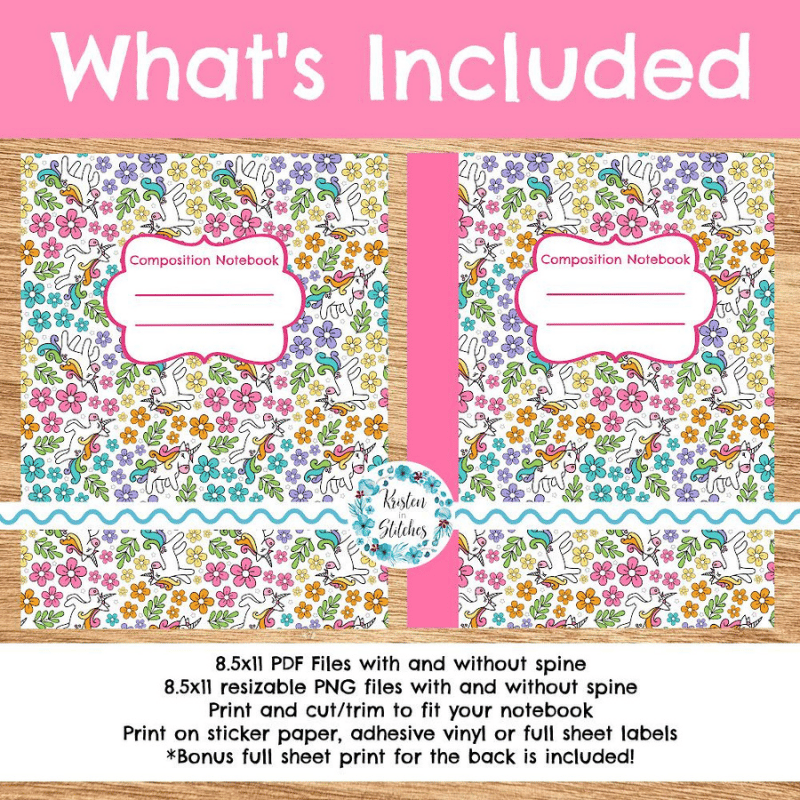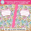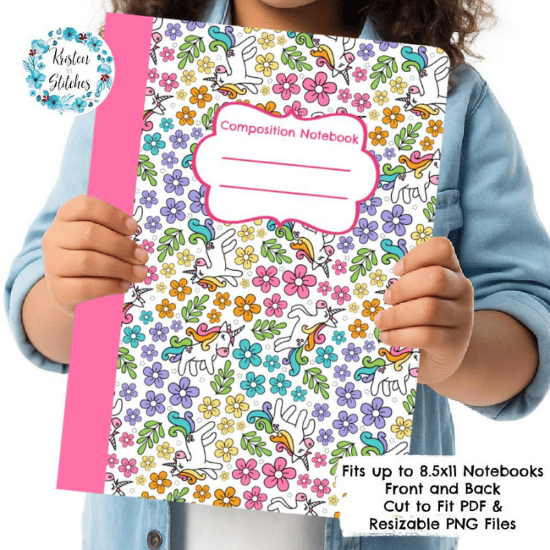Composition Notebook Cover, Printable Resizable PNG, PDF, Colorful Rainbow Unicorns and Flowers