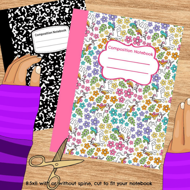 No more boring black and white composition books! This printable cover will make your notebook stand out! Size to fit any notebook up to 8.5x11- just print, cut and stick. Composition book measurements differ from brand to brand- you don't have to worry about sizing when you can cut it to fit perfectly.