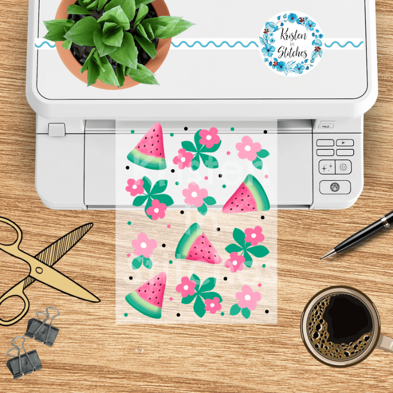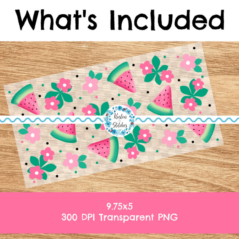 Features pink watermelon and flowers.