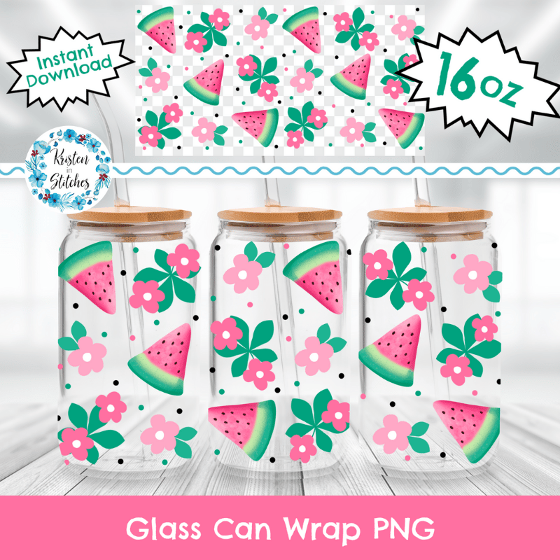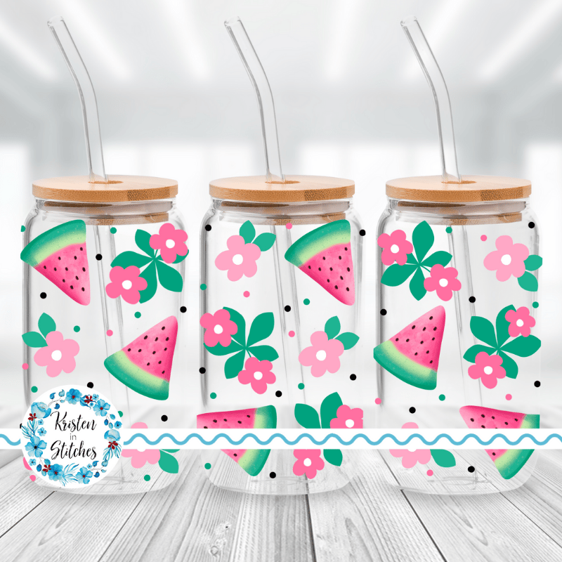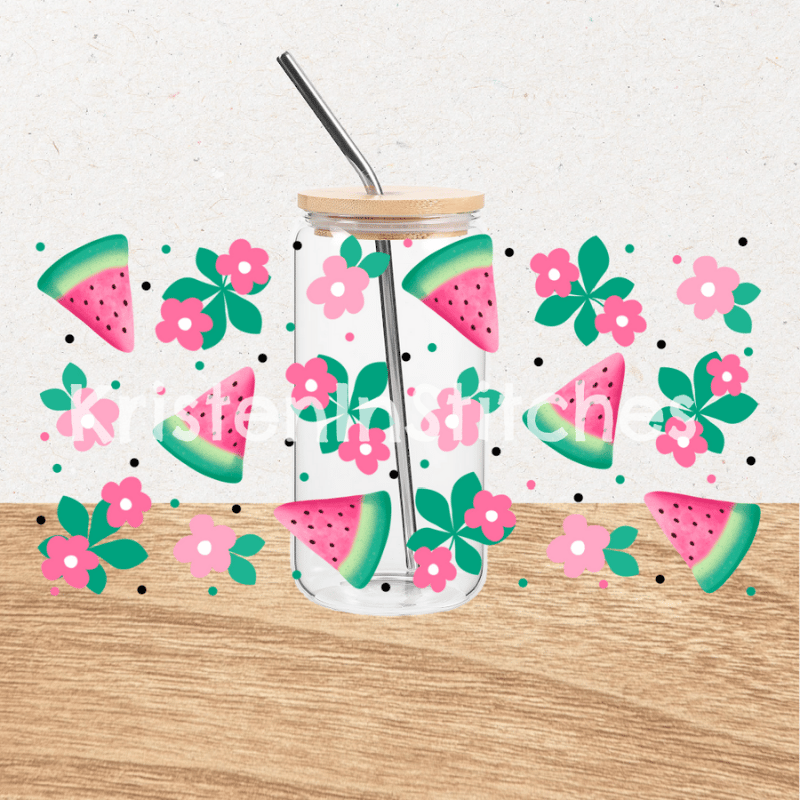 Pink Watermelon and Daisy Flowers Glass Cup Can Wrap Transparent PNG, Fruit Floral