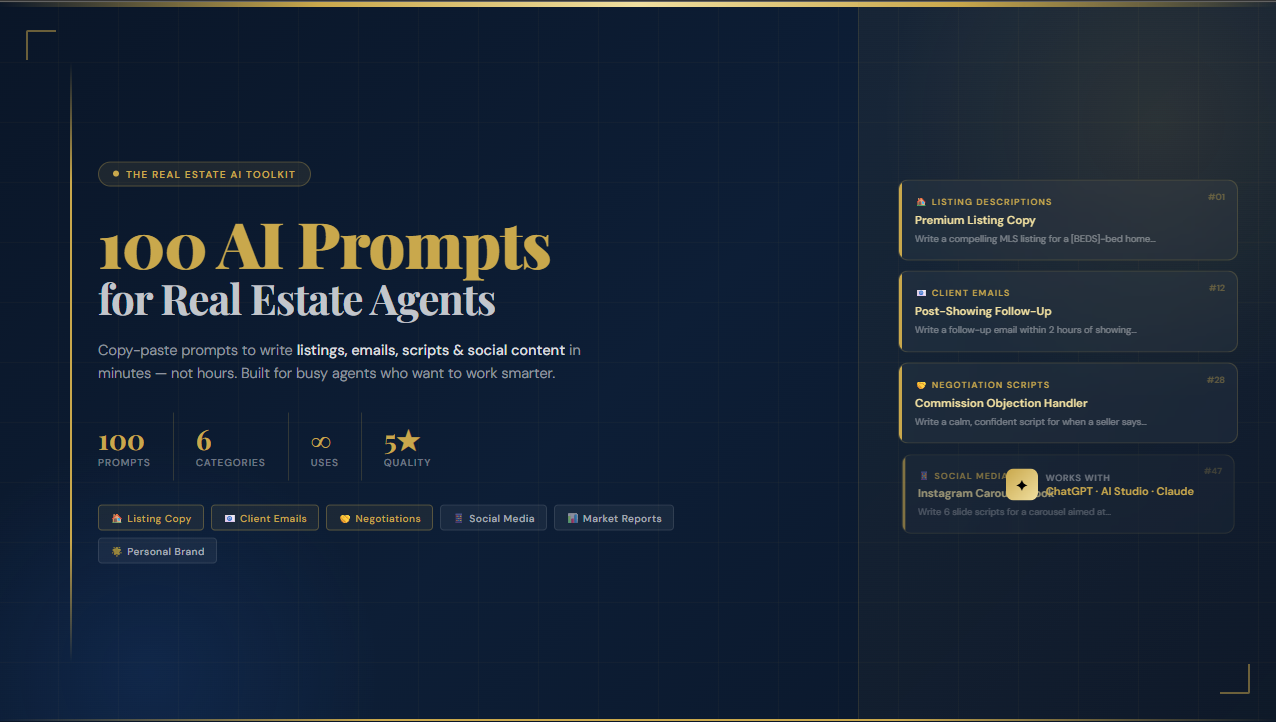 100 copy-paste ChatGPT & AI Studio prompts for busy agents. Write killer listings, client emails, negotiation scripts, and social content — in minutes, not hours.