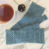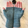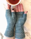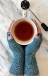 These are a seamless design, knit in the round. They begin and end with an eyelet mesh, with a wide twisted rib that connects both. The thumb gusset is created by simple increases forming a continuous wide twisted rib pattern. And it comes with a bonus for those of you who love knitting 2-at-time mitts – the same pattern is used for both the left and right mitts!