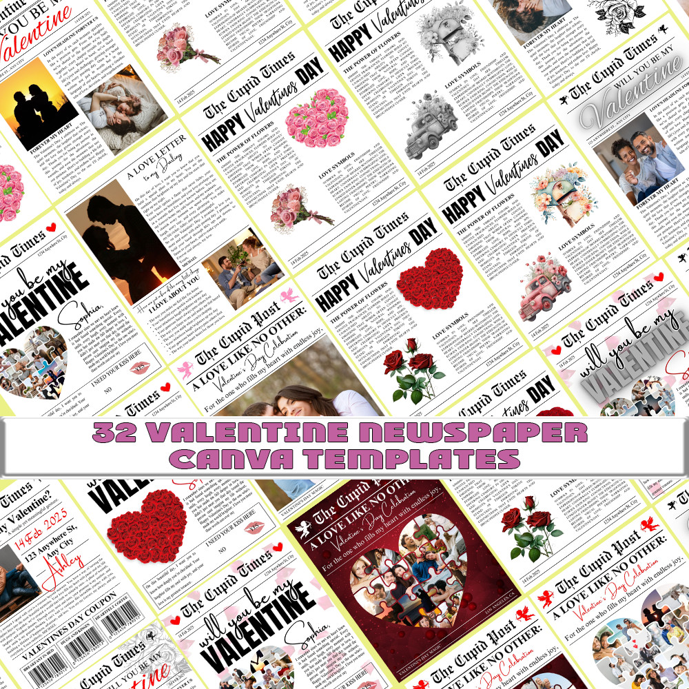 Valentine Newspaper Canva Template Bundle (32 Designs) | Editable Valentine Newspaper Templates | Drag & Drop Canva Layouts