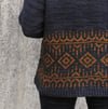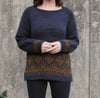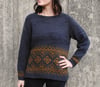 This garment is worked top-down, in the round. The yoke is shaped using a modified raglan construction, with short row shaping to optimise fit. Once the yoke is completed, stitches are separated into body and sleeves, which are each worked separately and in the round. The majority of the body features a stranded colourwork pattern. Sleeves are worked in plain stockinette with optional colourwork worked above the cuffs. Both the body and sleeves are finished with half-twisted rib to match the neckband.