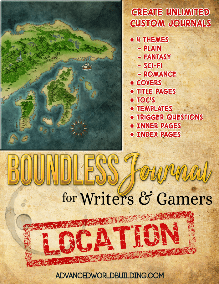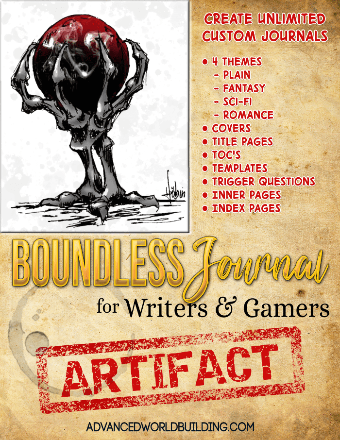 A custom themed, printable journal, is packed with templates and ‘trigger questions’ to help you world build bigger, better, and faster than ever.