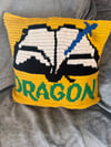 The Book Dragon Mosaic Overlay Pillow Cover features the words "Dragon" and a book with a sword embedded. Thanks to the mosaic overlay technique, this design has gorgeous detail and texture, great for crocheters who enjoy detailed patterns.